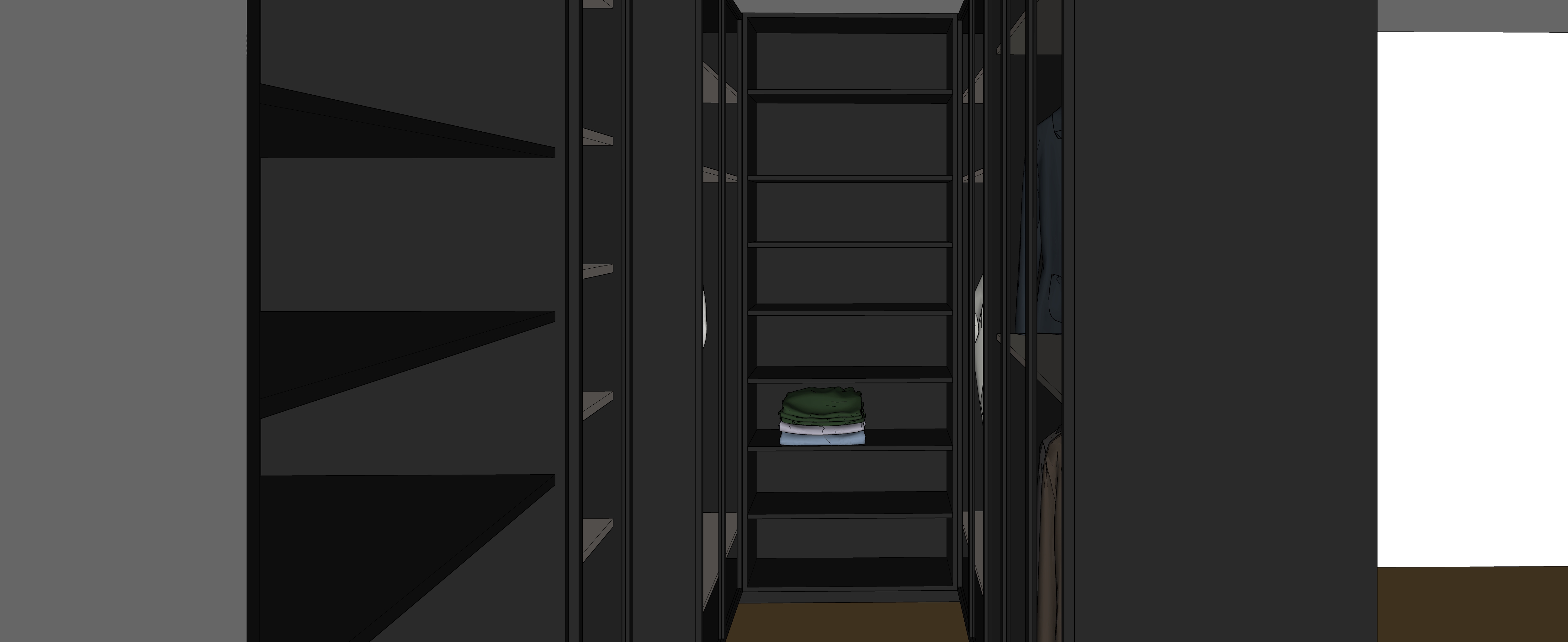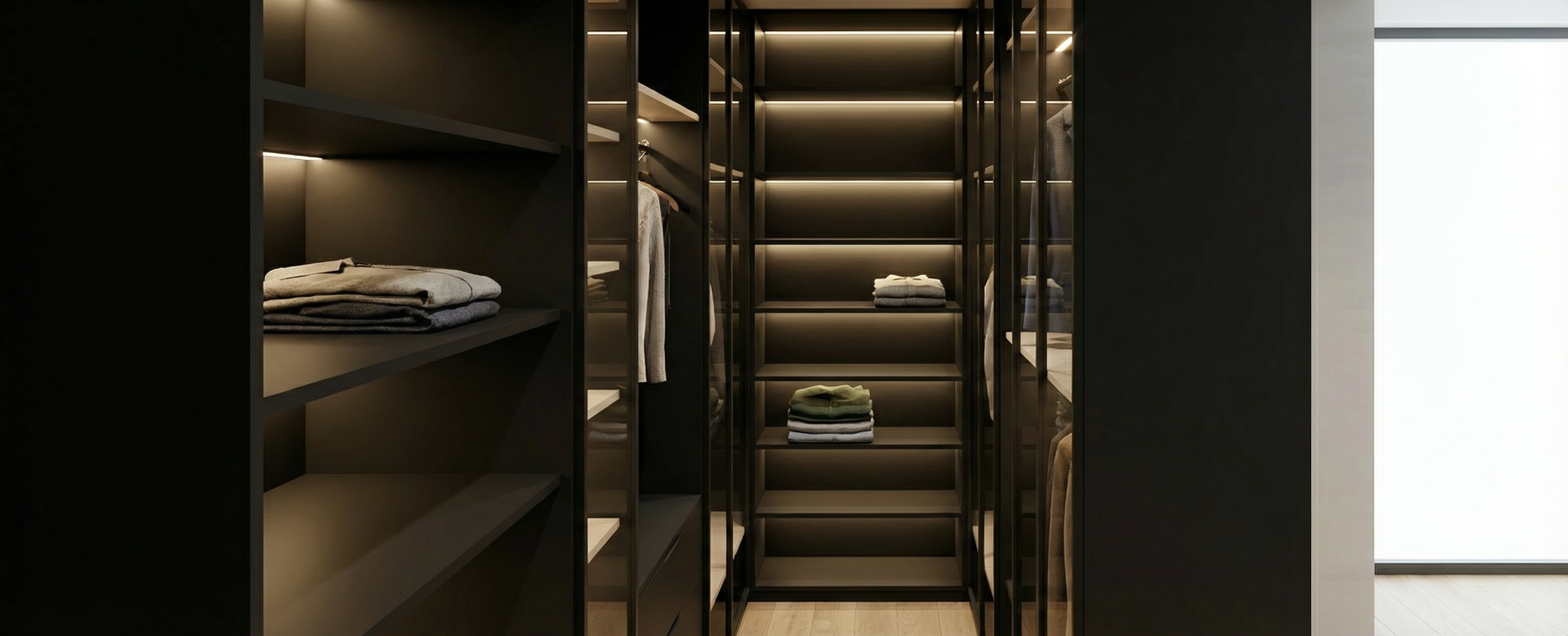 the floor is minimal wooden the closet is from minimal black melamine without wood lines put hidden lights at all the shelves make it more realistic do not change anything else