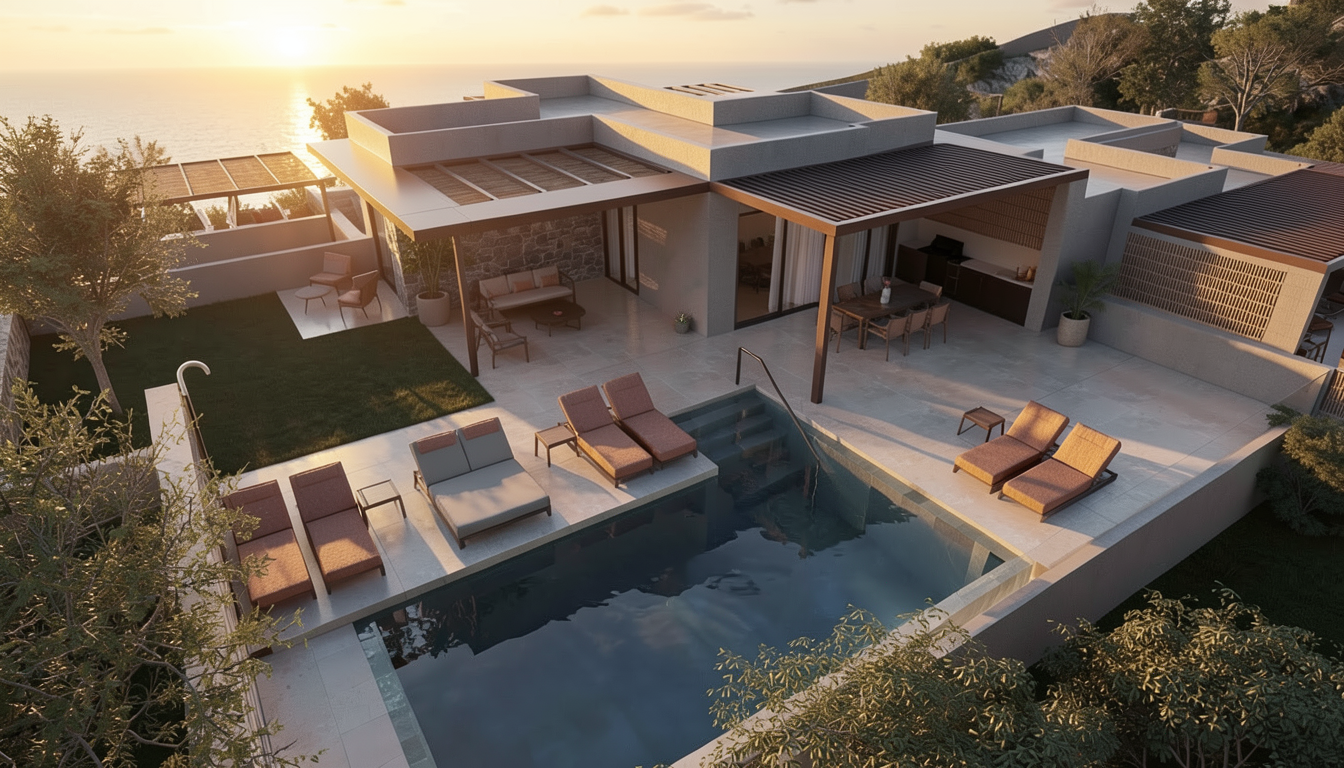 do not change the geometry and colors and materials the ceiling light fixture which is round in shape should be turned on add decoration to the green shelves in the centre such as books and similar accessories put a composition of small circle mirrors on the wall to the right put decoration on the dining table
