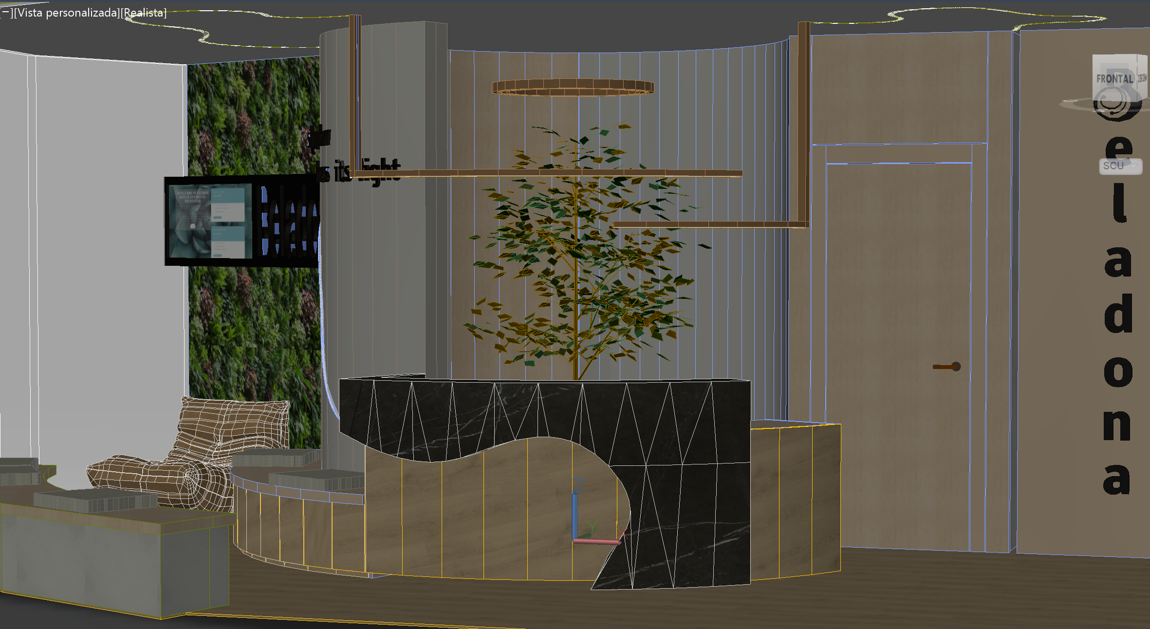 generar imagen hiper realista a adir pantalla pc en mostrador viendo la parte trasera mac a adir una persona sentada en el sillon y una persona en la recepcion