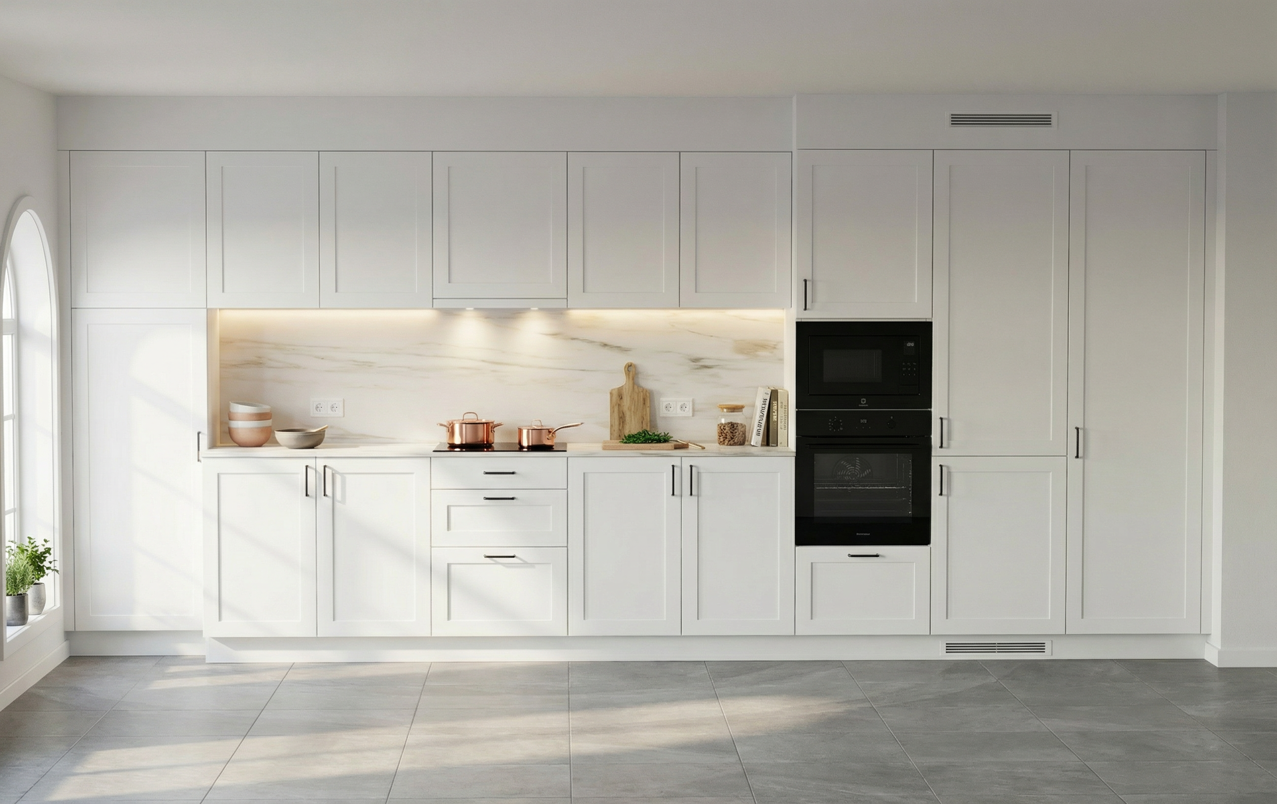 modern kitchen with two stool and kitchenisland backlighting no sun