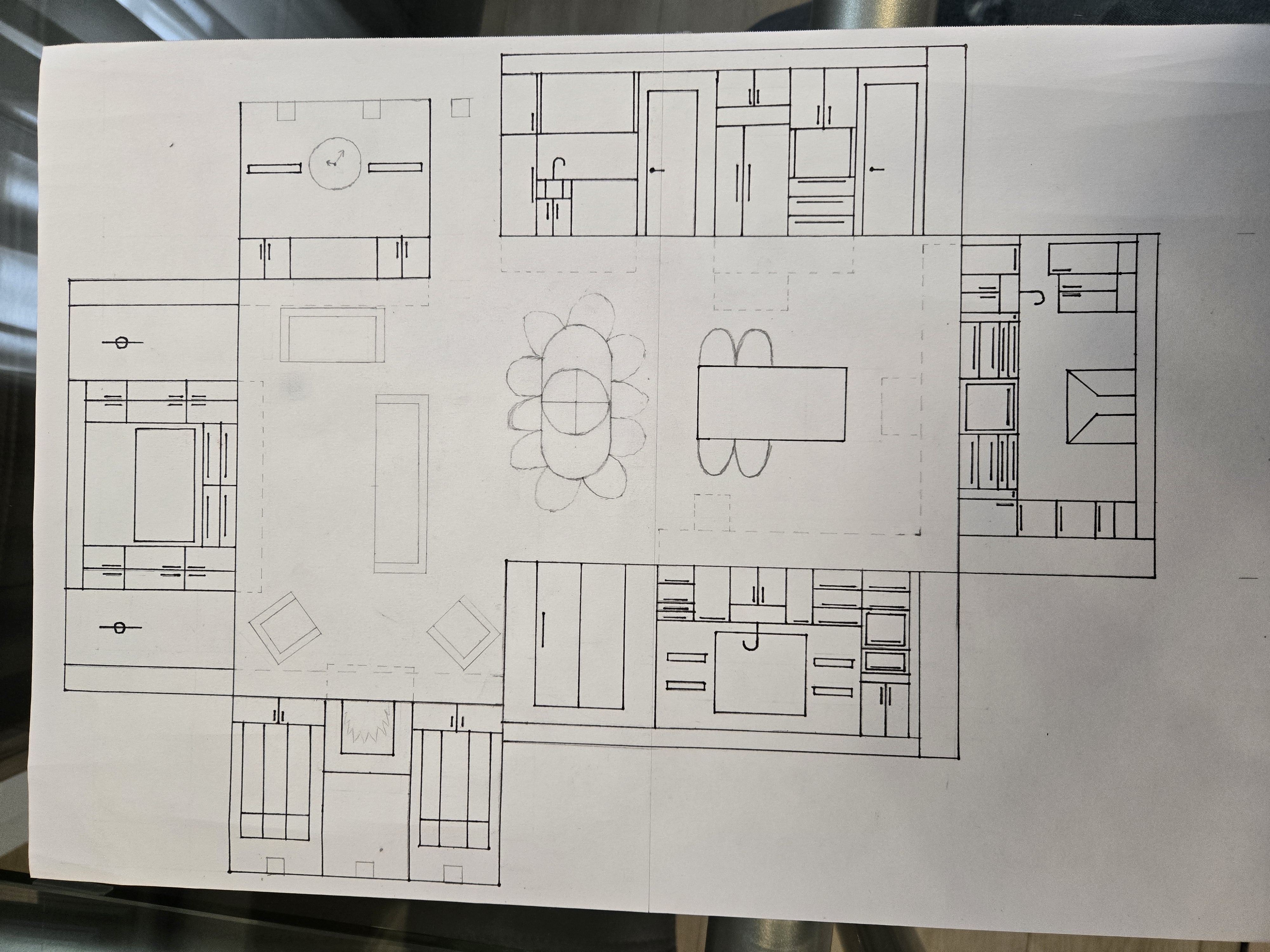 the picture is a floorplan of an open concept kitchen dining room and living room with elevations for each wall generate a realistic 3d rendering with modern design