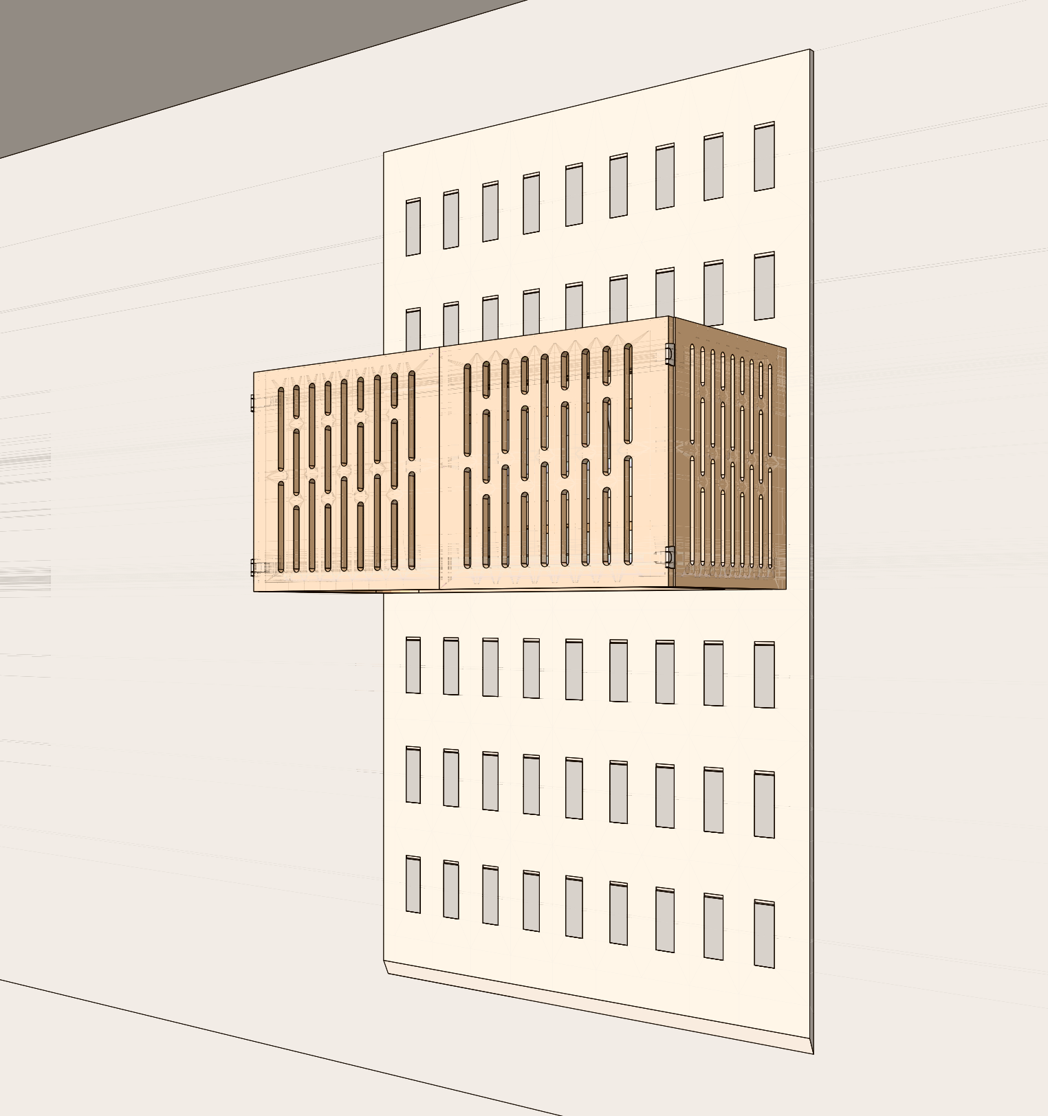 a beige modern building with a central protruding structure featuring vertically slotted windows the protrusion is highlighted with a warm wood tone creating contrast against the building s neutral background the windows are adorned with dark gray reflective glass the scene is set under soft daylight casting gentle shadows and enhancing the sleek minimalist architecture the atmosphere is calm and sophisticated architecture