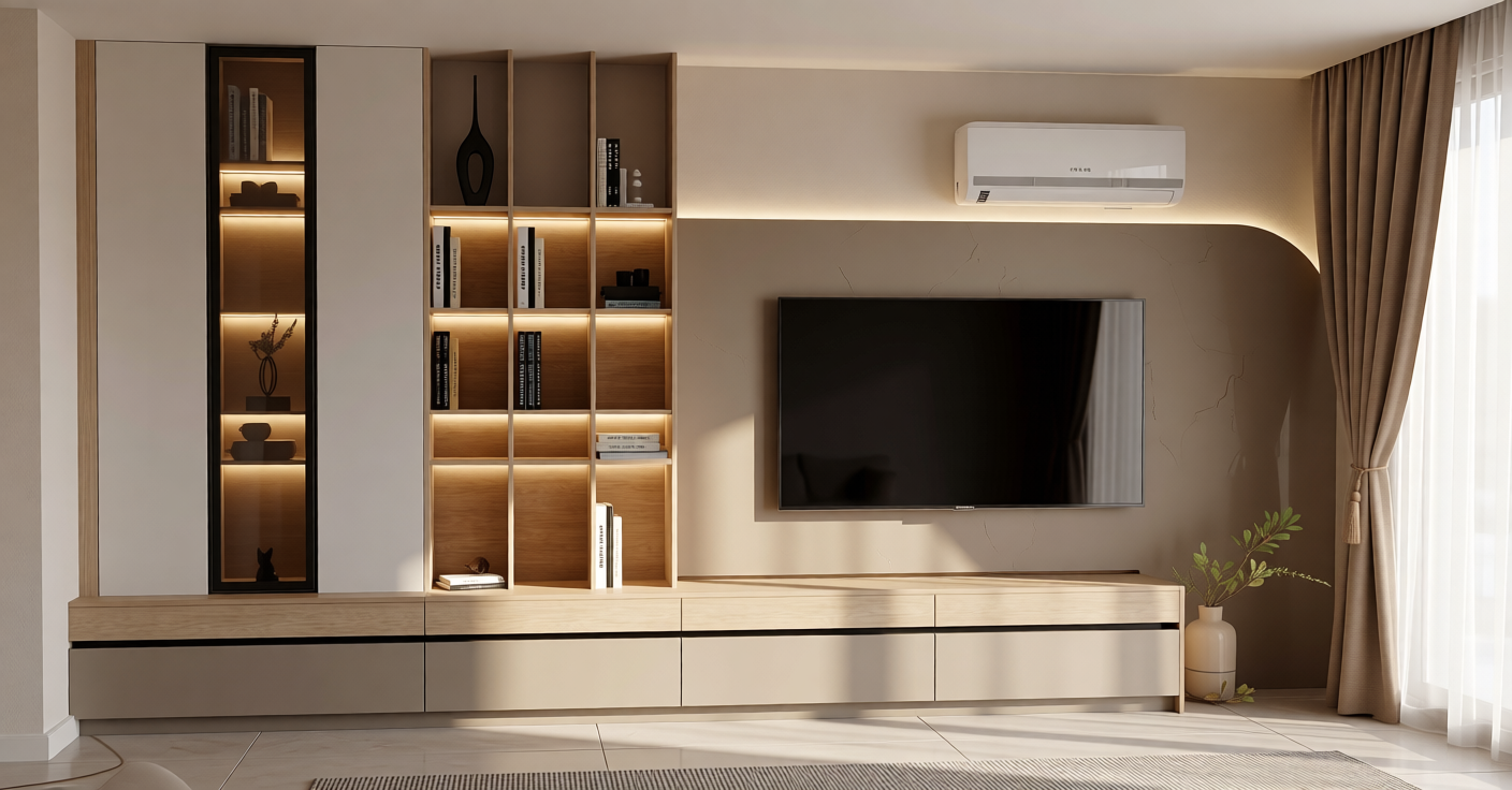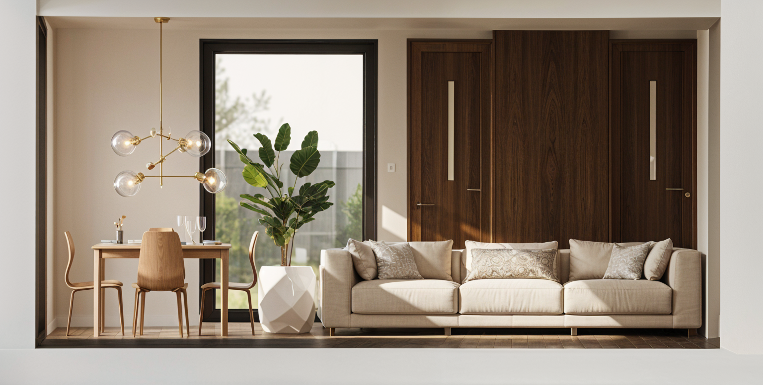 create a render in hyper realistic architectural visualization quality 8k resolution all objects furniture architectural features must remain in place do not add any objects or delete anything from the image the spatial configuration must remain unchanged the ground is more white beige with a baseboard doors are white the reference image is the same space from another angle metallic part of windows is black render source image ceiling with wholes on the part on the left more ambient light and less natural light the banket is more wood and texture the tables are with wood
