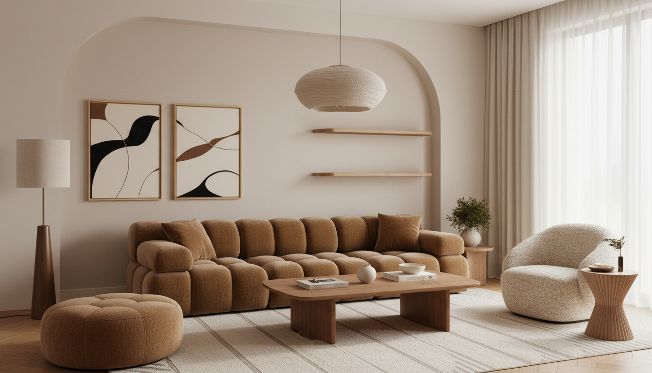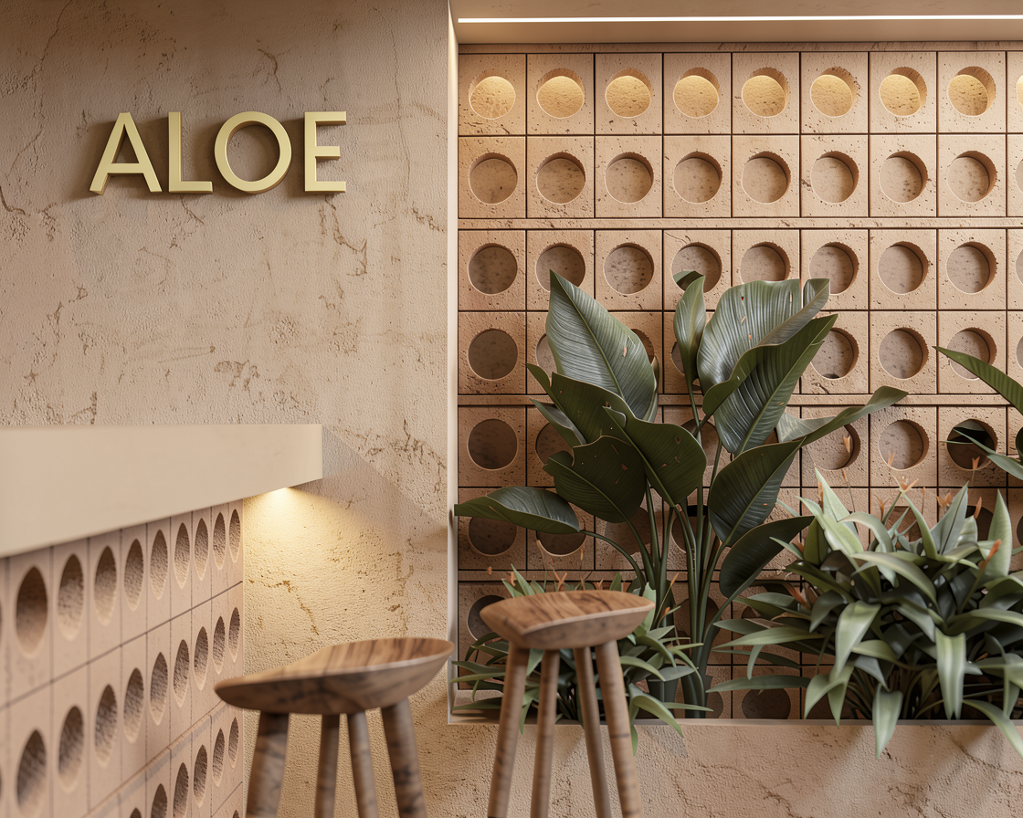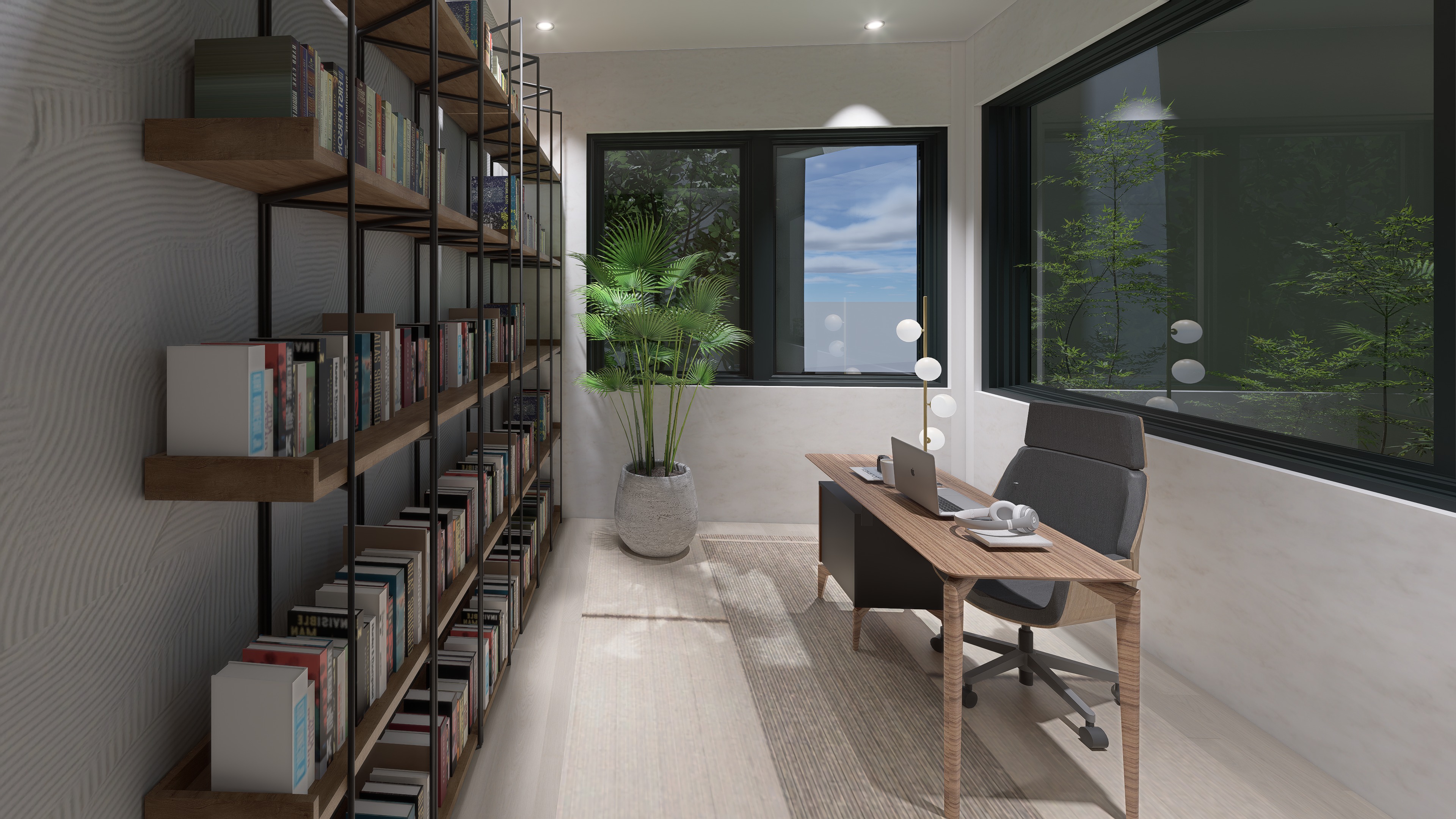 a modern serene home office with a peaceful atmosphere the room features a long bookshelf with wooden shelves and black metal frames filled with colorful books a sleek wooden desk with a laptop and headphones rests on a light beige woven rug a comfortable gray office chair with a swivel base is beside the desk a large window showcases a vibrant green potted plant with broad leaves inside and lush green trees outside against a bright blue sky the walls are textured with subtle patterns in soft white and the ceiling has warm recessed lighting
