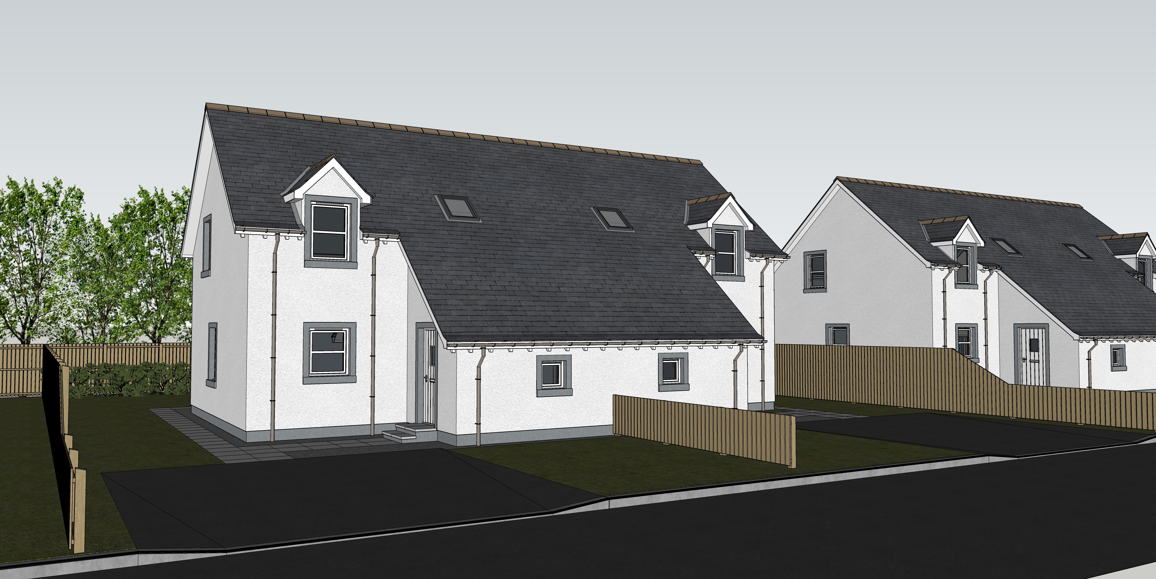 create a photorealistic render of this image on a bright sunny day with landscaping to the garden and a family car on the driveway with a manicured lawn