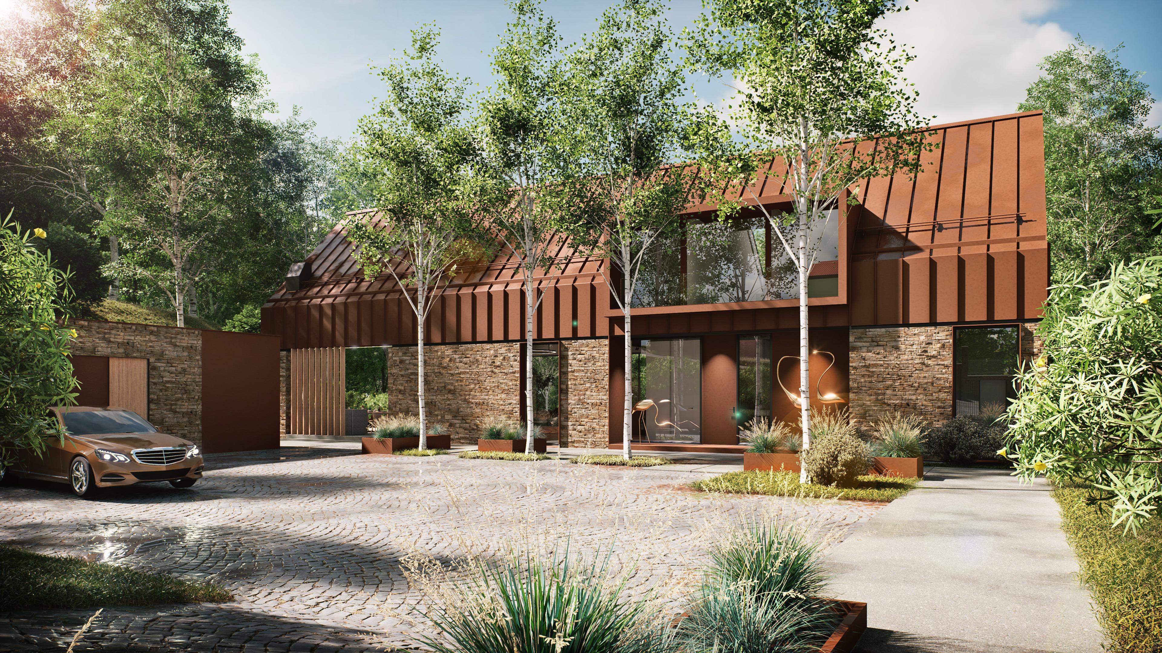 important preserve the existing geometry and the existing context exactly as provided do not modify alter reinterpret add remove scale or reshape any geometry do not change the site surroundings street layout neighboring buildings vegetation or context elements do not modify geometry scale proportions buildings road layout sidewalks or surrounding context in any way warm interior lighting visible through windows soft and natural neutral exterior lighting realistic light falloff photorealistic architectural rendering clean and balanced contrast calm cinematic mood style contemporary european residential architecture minimalist premium understated