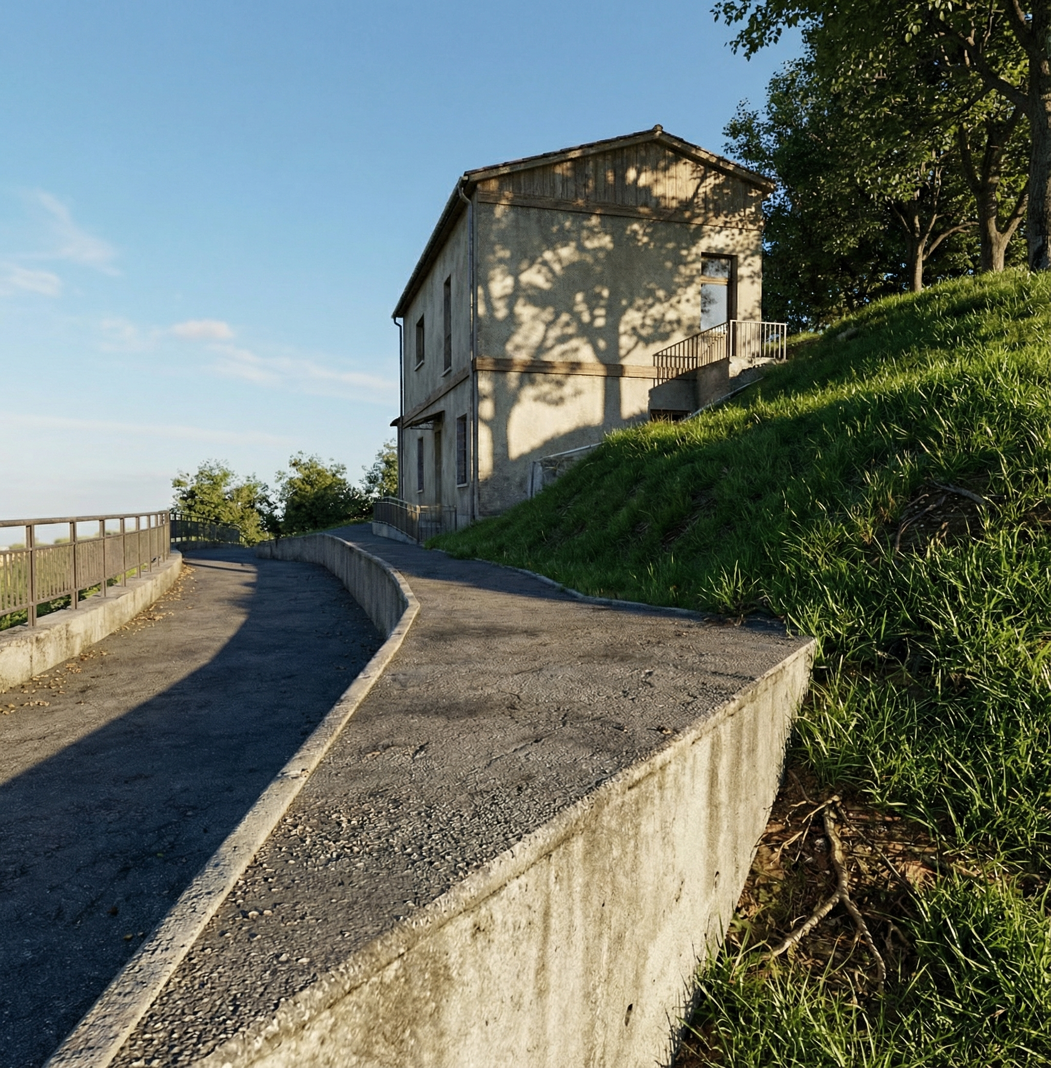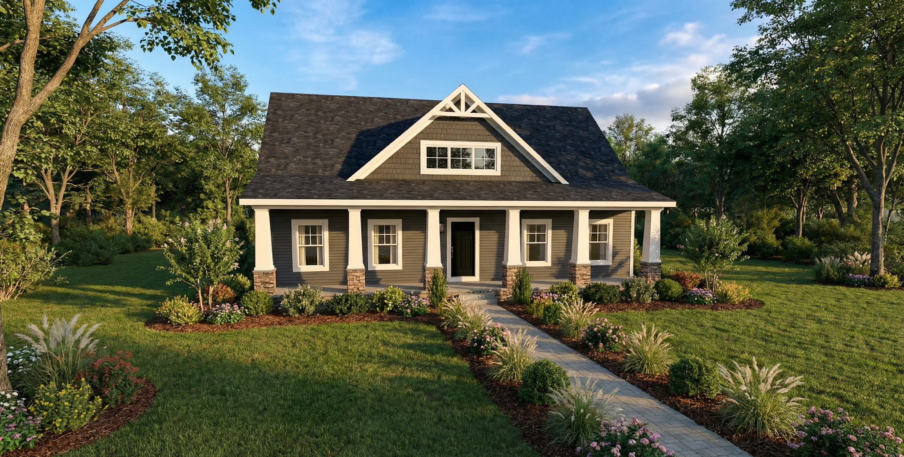 make as photorealistic as possible while keeping textures the same as selection professional landscaping in a lightly wooded scene with good lighting white siding black shingle roof black windows to match plan black front door no garage