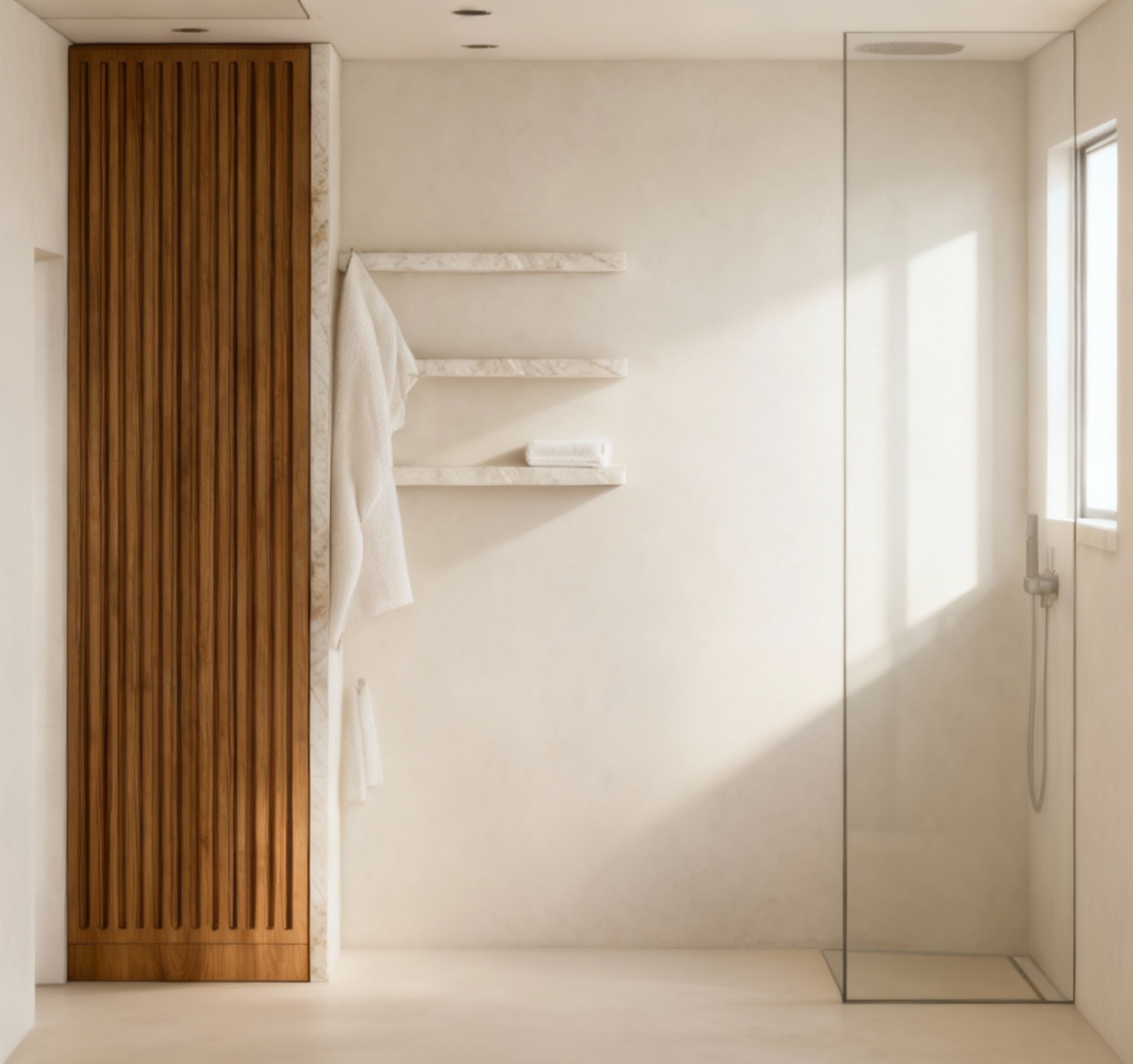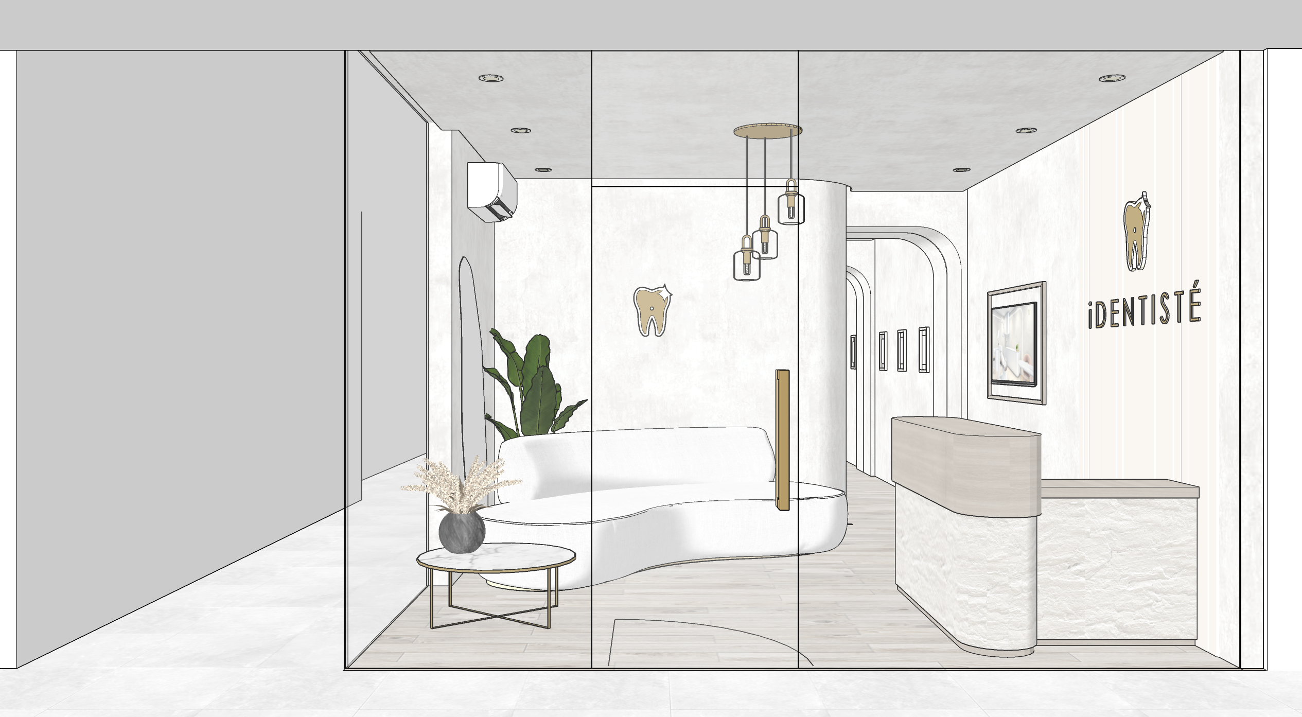 a modern dental office interior with a minimalist design featuring clean glass walls the color palette should include soft whites and creams for the walls and ceiling complemented by light wood flooring the curved sofa is pure white and the round table has a marble top with subtle golden accents on the frame add a black vase with light beige pampas grass on the table the logo and signage should be in gold and black creating a sophisticated and welcoming atmosphere ensure the lighting is warm and inviting with elegant pendant lights hanging from the ceiling architecture