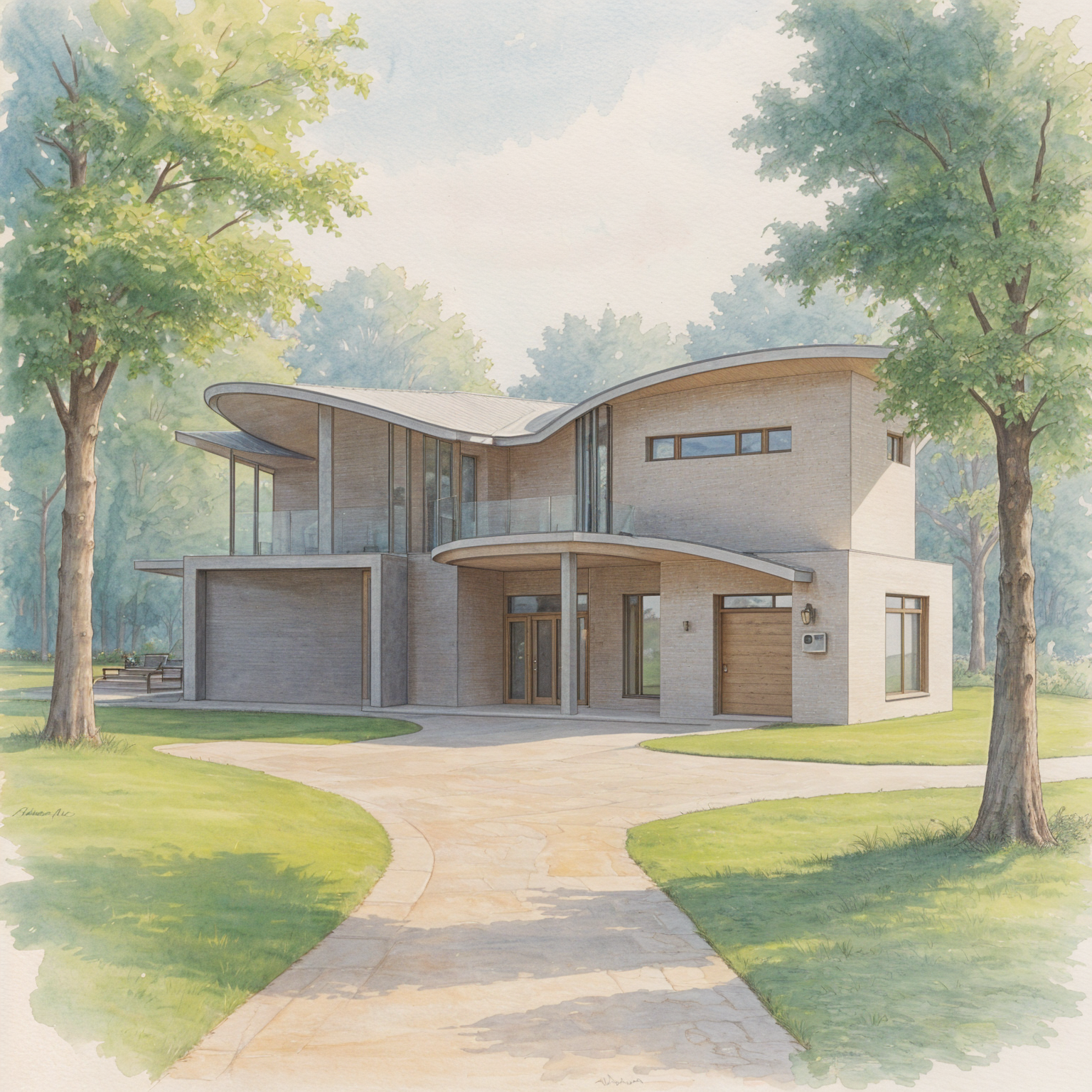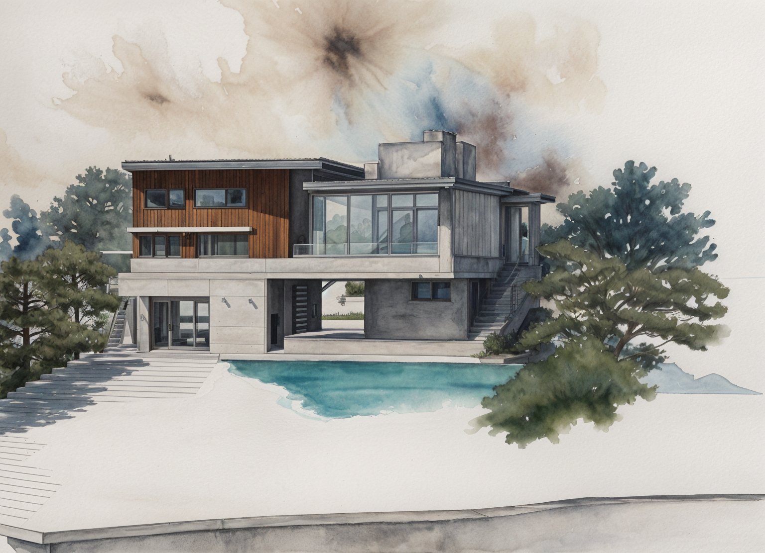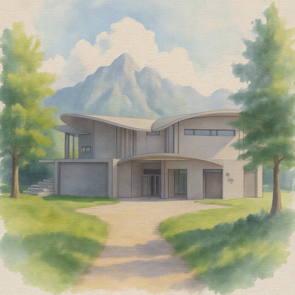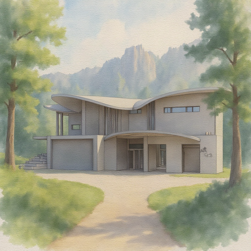 architectural watercolor rendering of exteeior view looking towards front of research facility in a forest environemnt looking at towards building entrance with paths leading up to it the opposite side of the building is partailly hanging off a cliff so you see the sky in the background realistic materials background and edges dissolve into loose watercolor washes and white paper edges not full bleed with soft unfinished fade around the image visible pencil and ink linework with light technical annotations artistic yet grounded balance of precision and painterly abstraction calm morning light concept architectural visualization style