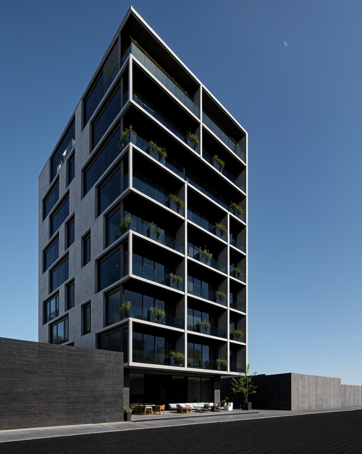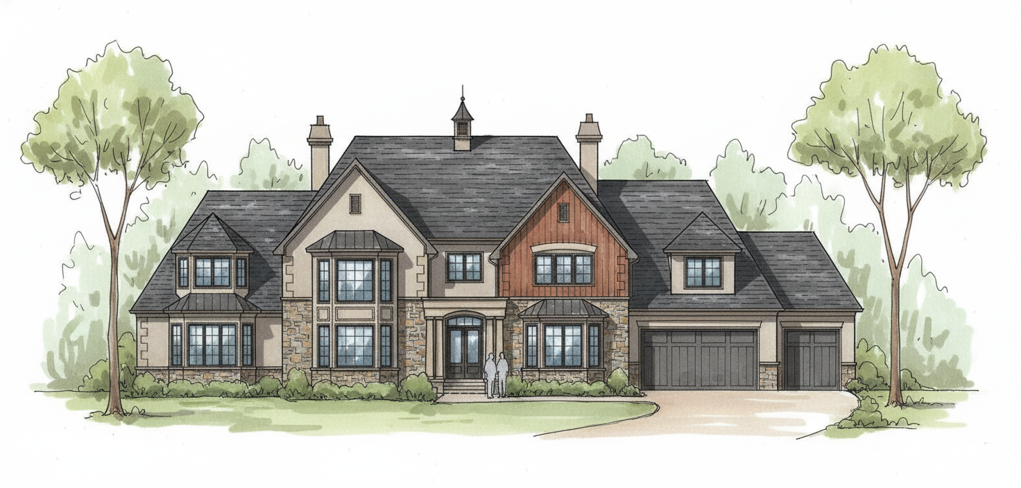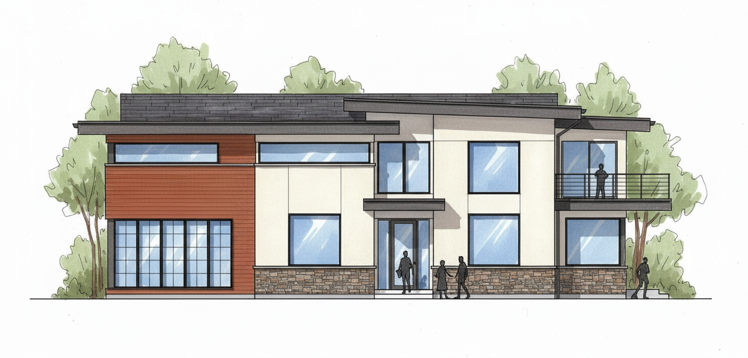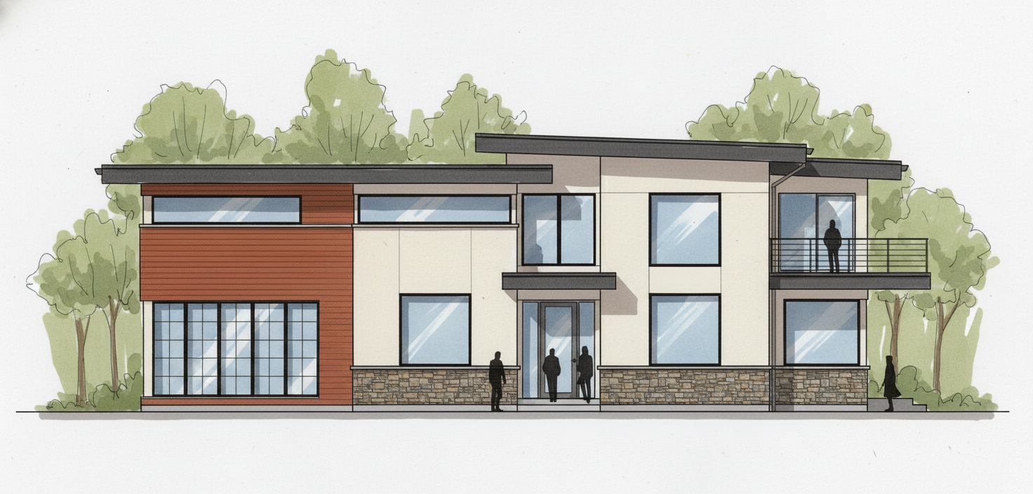 architectural watercolor rendering of exteeior view looking towards front of research facility in a forest environemnt looking at towards building entrance with paths leading up to it the opposite side of the building is partailly hanging off a cliff so you see the sky in the background realistic materials background and edges dissolve into loose watercolor washes and white paper edges not full bleed with soft unfinished fade around the image visible pencil and ink linework with light technical annotations artistic yet grounded balance of precision and painterly abstraction calm morning light concept architectural visualization style