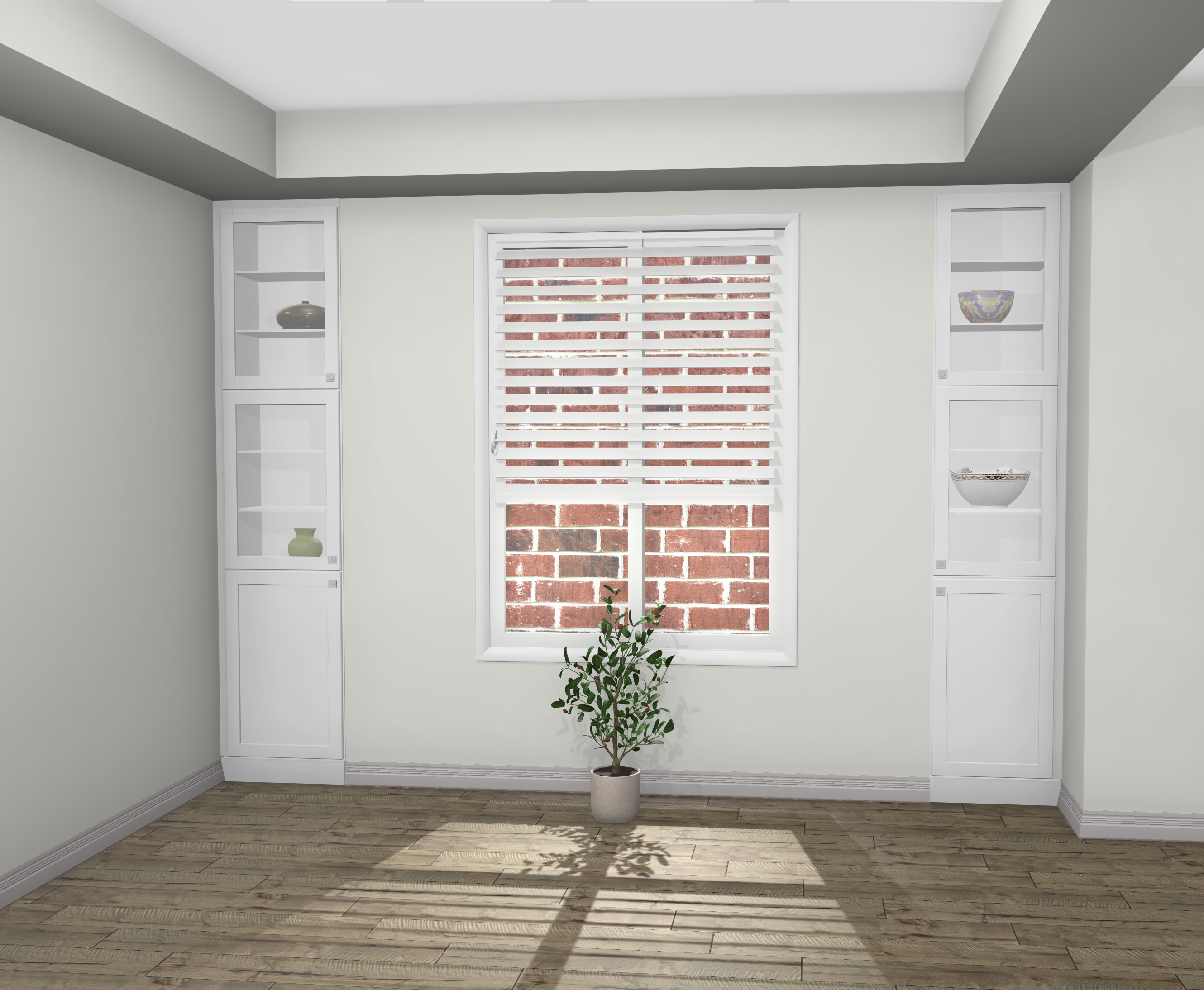 make the shelves behind the glass doors also glass and add lights in those cabinets
