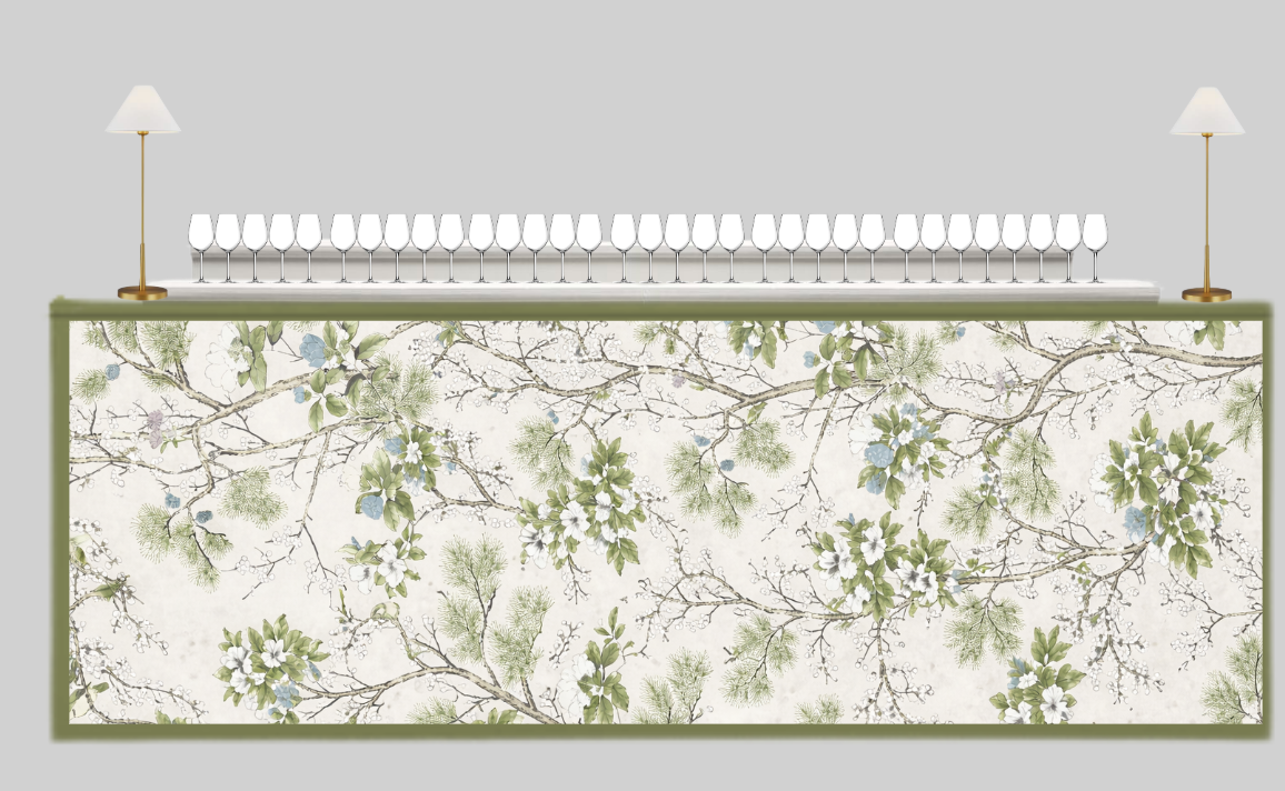 this is a bar with a wallpaper front this will be indoors with white traditional fireplace behind it render in evening lighting have the lamps on