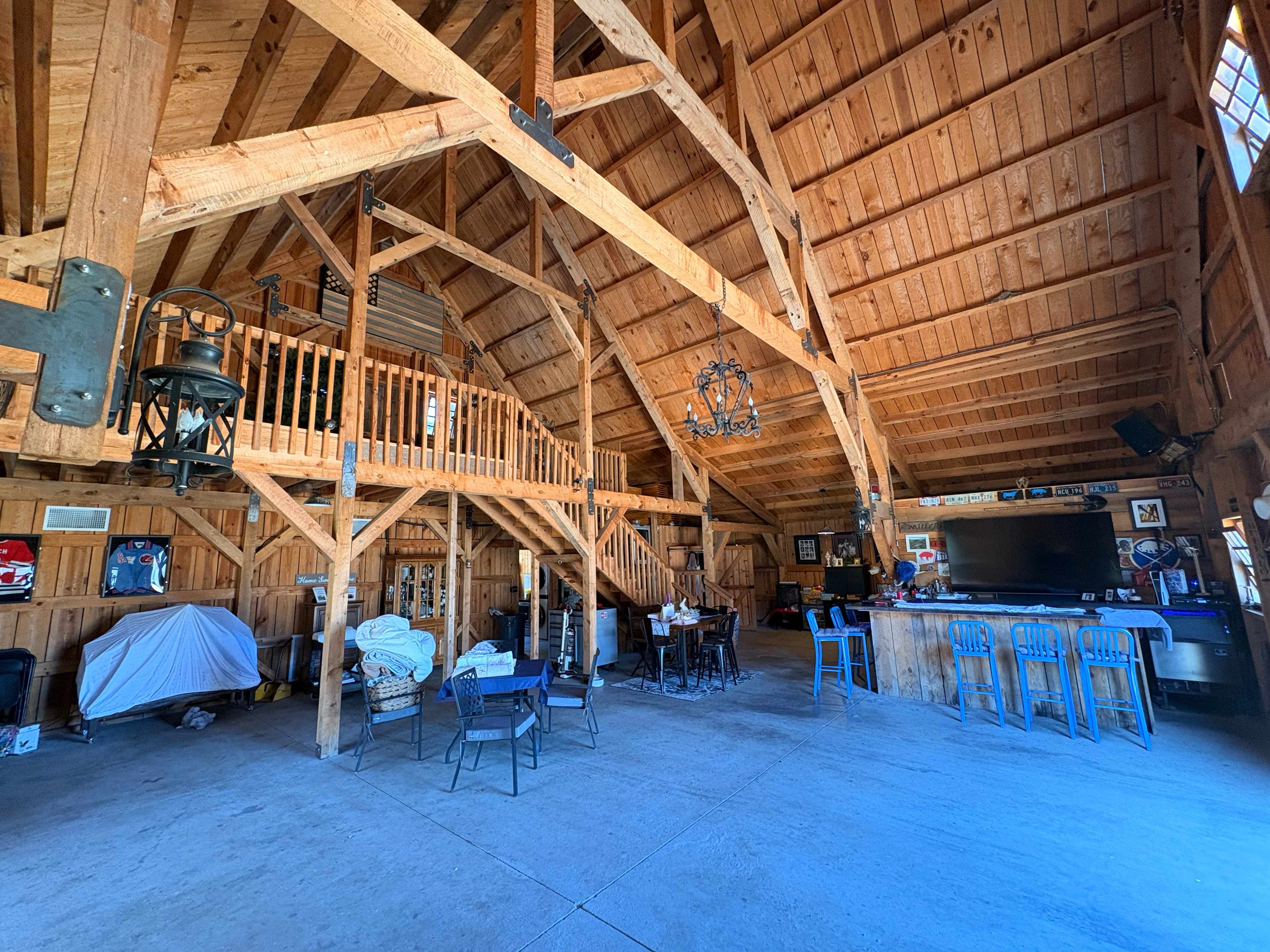 create interior bourbon bar feel in space add leather club chairs bourbon lockers and interior details to make a club amenity feel that is luxurious add great lighting and people in image render in style of water color perspective casual style of an outdoor club people dressed casually flooring to be flagstone very loose rendering style with faded edges to image change walls to have fishing fly rods and antique guns locate seating in loft space