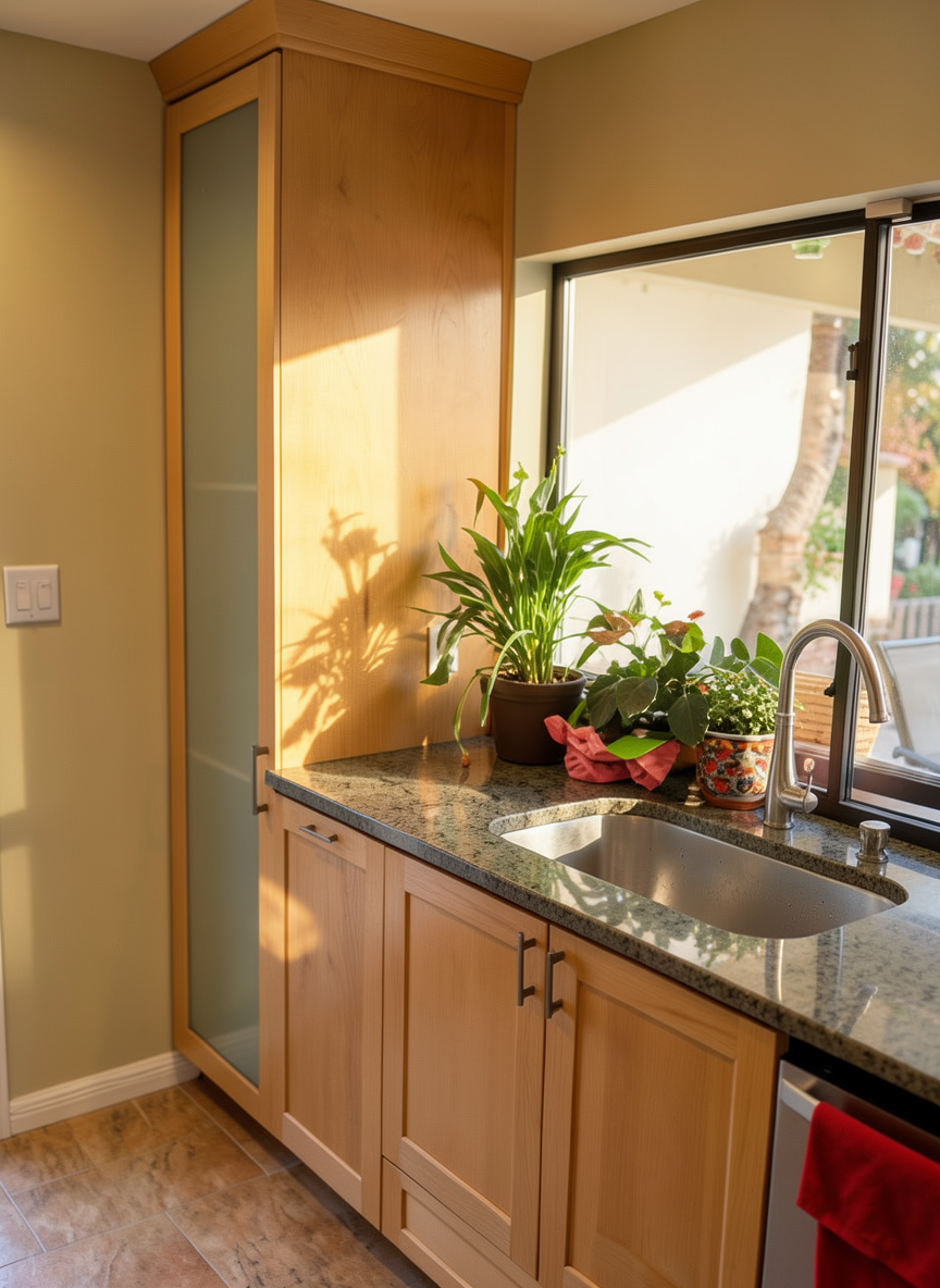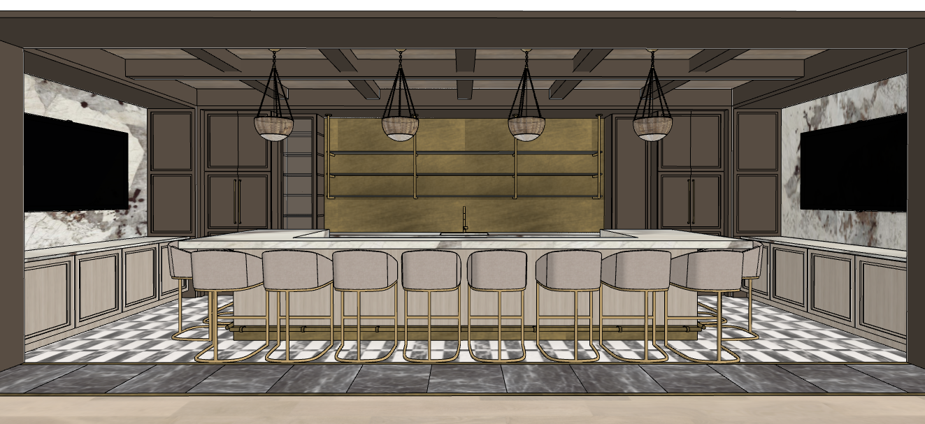 antique brass backsplash with brass and glass bistro shelves dark brown painted cabinets with white wash oak lower cabients patagonia quartzite granite marble tile flooring wood paneled ceiling with brown painted beams