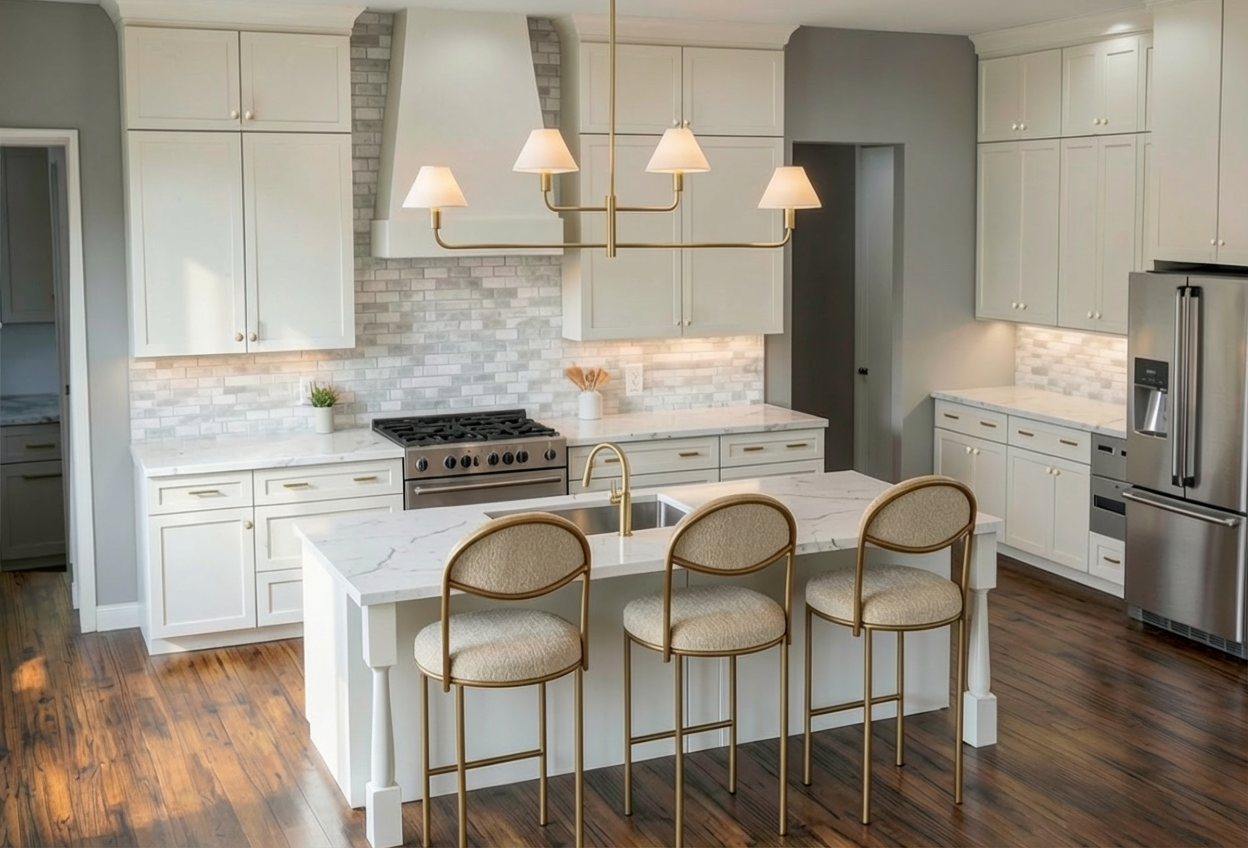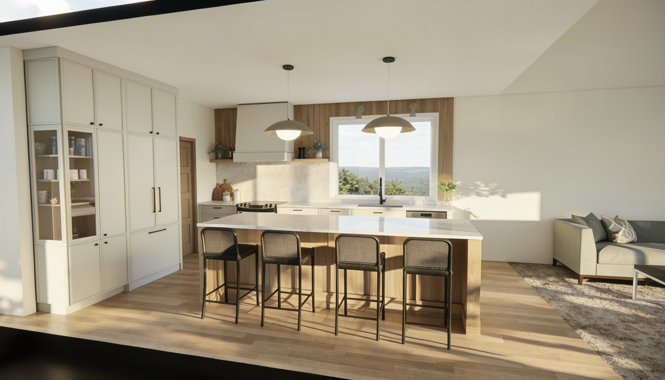mode archsynth maintain precision photorealistic interior rendering input geometry absolute lock use the provided kitchen sketch as exact geometry reference cabinet layout proportions and joints must remain identical do not modify cabinet divisions or panel lines built in oven locked v zug single built in oven standard 60x60 cm one single glass surface only below cabinet front in formex 3177 no glass extractor hood corrected fully integrated extractor wesco evm 218 start upper cabinet front above hood must be identical to all other cabinet fronts formex 3177 not stainless steel visible only on underside two separate horizontal stainless steel panels brushed finish clearly divided not continuous perfectly flush with lower edge of upper cabinets no visible hood body cabinet fronts color lock formex 3177 eiskaffee light warm beige matte uniform no grey or dark tone countertop backsplash iron pearl natural stone polished neolith just white backsplash floor dark oak vinyl parquet visible wood grain matte dining table xena style reference solid wood table organic boat shape strong expressive wood grain warm dark brown tone sculptural central base multiple legs merging into one structure elegant and slightly dynamic geometry chairs xena style organic softly shaped seat shell black or very dark upholstery matte wooden legs matching table slightly curved comfortable appearance high quality modern design decoration minimal one ceramic bowl one slim vase with branches no additional objects lighting soft daylight even illumination accurate color rendering style high end swiss kitchen calm minimal material focused no artistic stylization negative constraints no stainless steel cabinet front above hood no single piece hood panel no incorrect table geometry no generic dining furniture no cabinet layout changes output photorealistic precise material definition accurate furniture design