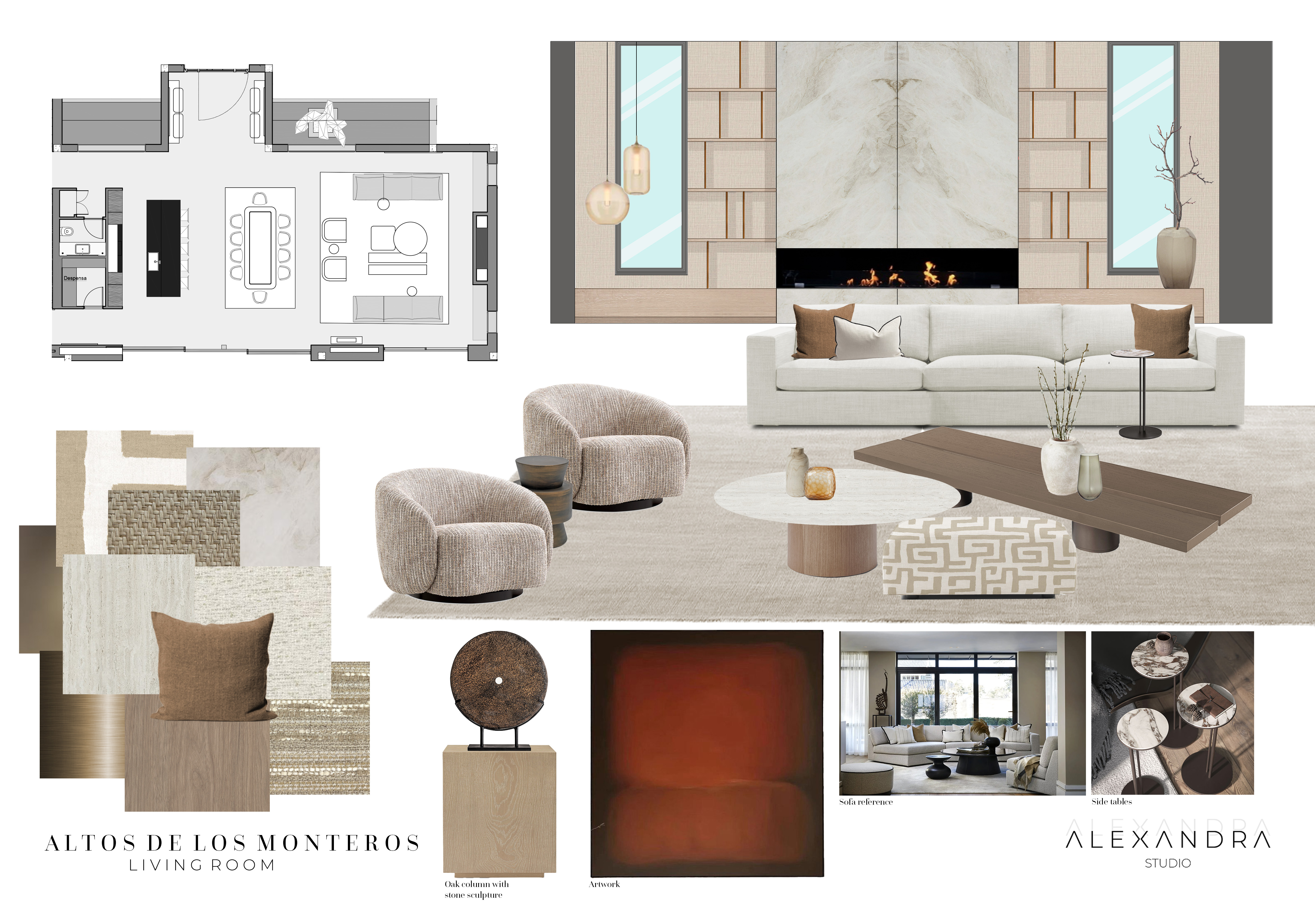 interior shot make this conceptual moodpboard with floor plan into a 3d image the colours are earthy