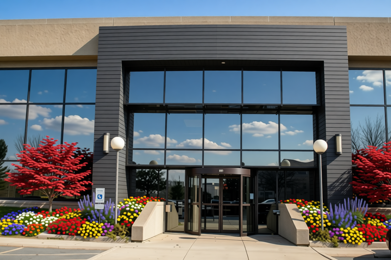 make the clad surround higher than the rest of building add seegers signage at the top of the surround add led light into the surround and back of the signage keep the curtain wall as is and add clad the rest of concrete walls of the building with aluminum panels to match color of dark gray surround