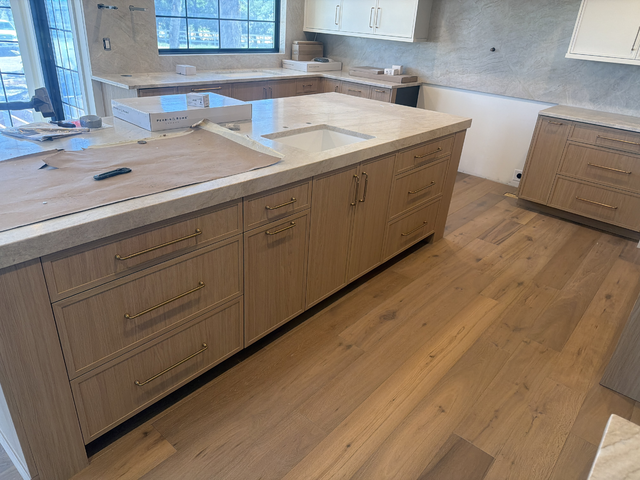 do not change the cabinets in any way preserve the exact cabinet colors materials finishes dimensions door and drawer styles hardware spacing alignment and all geometry exactly as shown do not alter the countertop shape backsplash appliances flooring lighting fixtures or wall structure only remove the construction materials clutter and mess from the scene clean the room and make it look finished and staged add a few simple tasteful home accessories appropriate for the style of the space but do not add or remove any furniture windows or architectural elements maintain the original lighting direction and realism enhance clarity and polish the photo while keeping the cabinetry and room design completely unchanged do not alter the lighting to keep the cabinet colors as they are in the image clean up the dust on the top restage for an organic modern kitchen add a gold faucet to the sinks add a citeaux lacanche cream range in the opening on the back wall