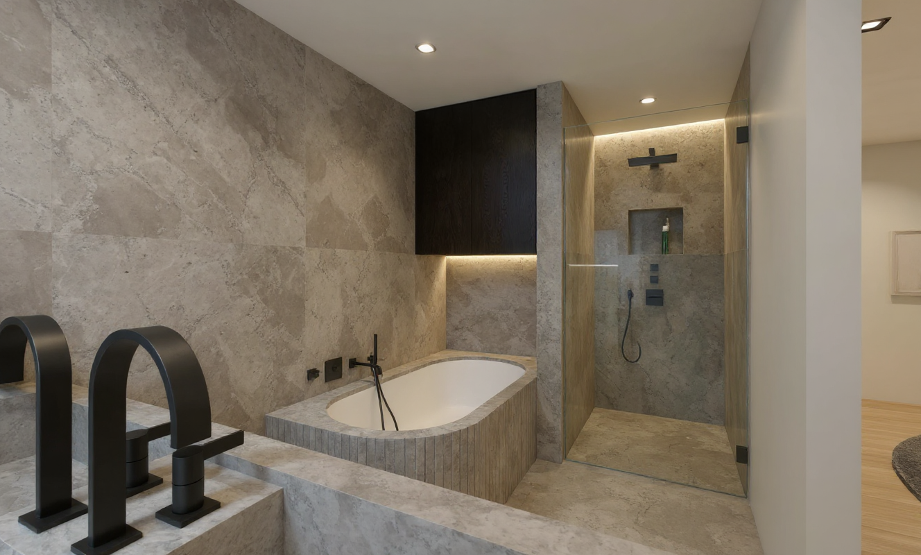 render a modern bedroom with a cozy and inviting atmosphere use soft beige and light brown for the wardrobe blending smoothly with light gray walls the bedding should have a white duvet with a light gray blanket and pillows in contrasting navy blue and warm terracotta incorporate dark gray horizontal blinds on the window adding depth the ceiling should be a light gray with sleek black recessed lights include a wooden nightstand with a small black clock and a stack of books add a plush light beige carpet on the wooden floor to enhance warmth and comfort