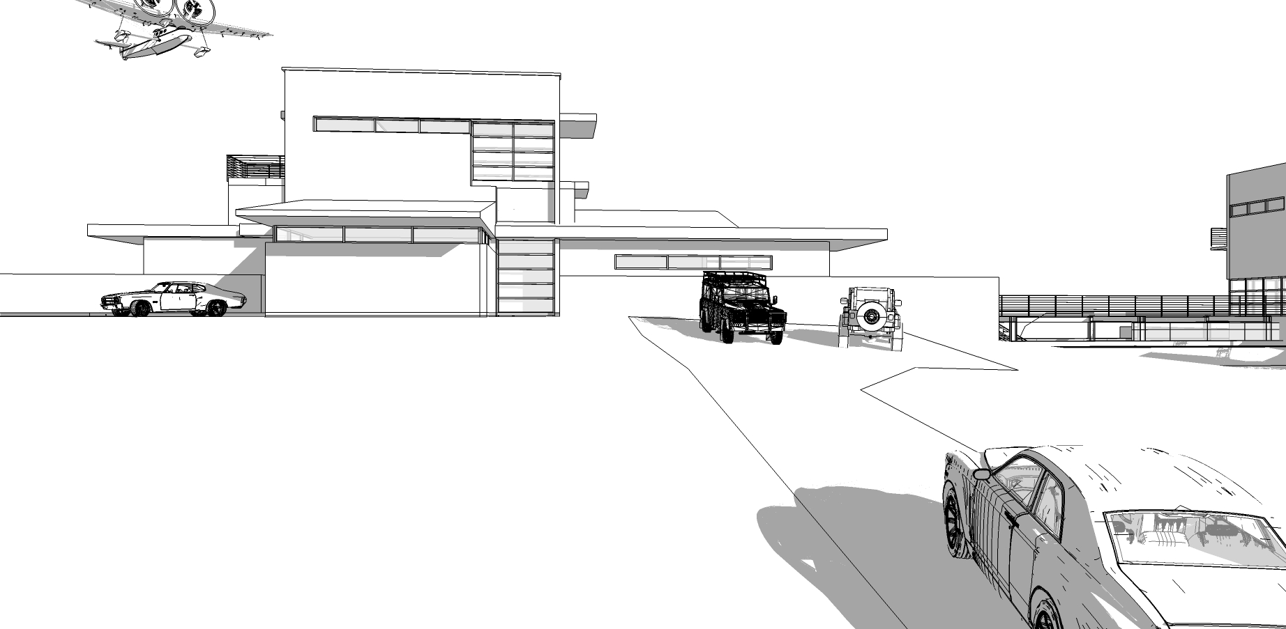 industrial design dynamic building lighting dusk corten and wood panels tall grass foreground