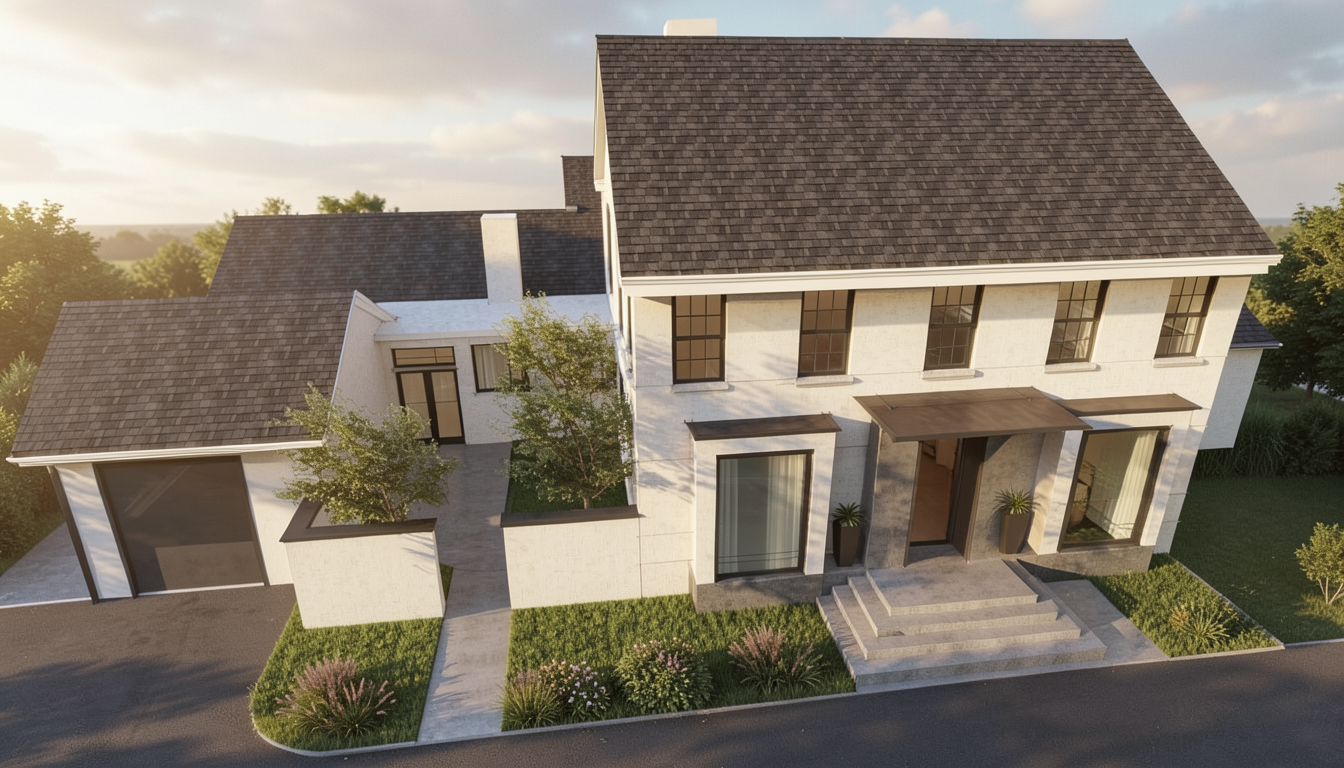 keep everything as is finish underside of room overhangs with greige metal change roof color to same as window color
