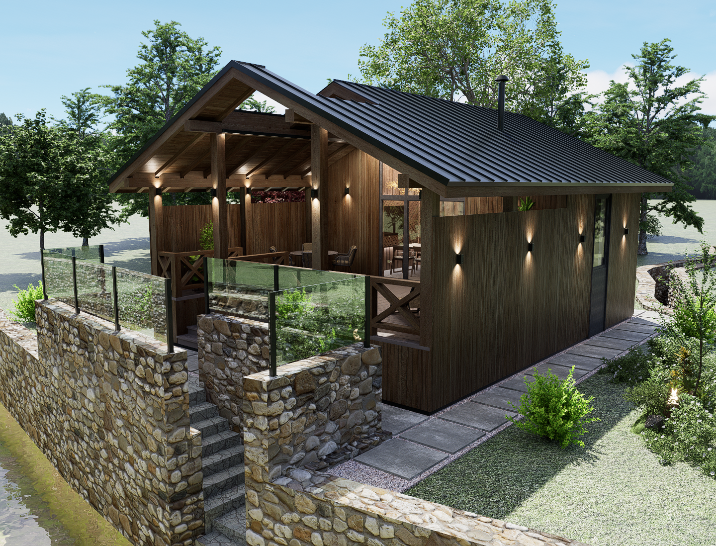 create a photorealistic 3d perspective of this house using the current material style but enhancing it use a graphite metal roof with a standing seam and vertical wood siding keep the model geometry unchanged windows doors roof walls sidewalk and driveway don t change the view just enhance the existing materials and enhance the landscape a beautiful atmospheric light blue sky with clouds detailed textures in the wood siding and reflections in the glass as well as a bright blue sky with clouds add subtle atmospheric depth rendered in hyperrealistic architectural visualization quality resolution