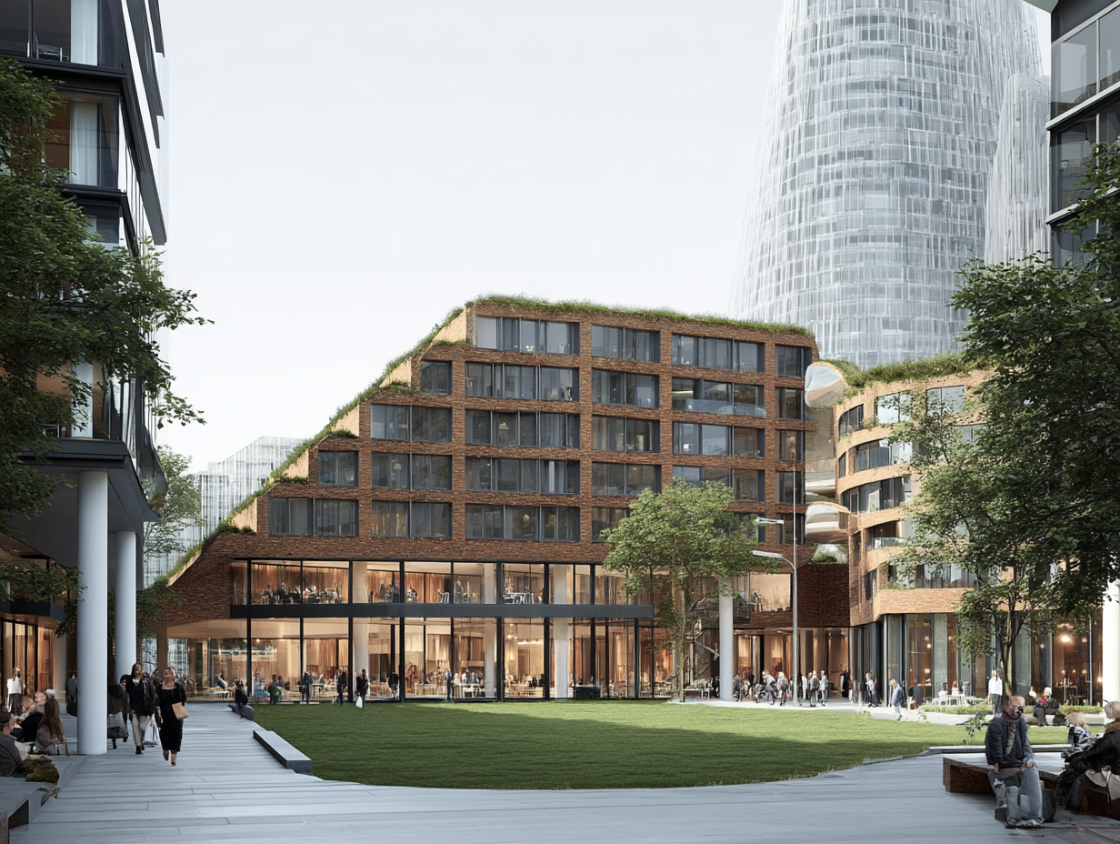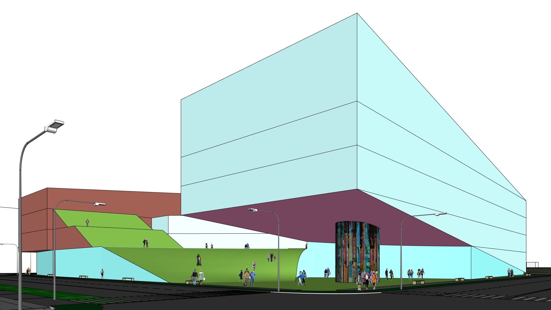 exterior shot create a vibrant architectural render of a futuristic urban park the main building structure is large and geometric with a sky blue facade the connecting bridge is earthy brown providing a contrast the sloping landscape is lush green creating a natural and inviting atmosphere incorporate modern street lamps casting soft warm light across the scene the cylindrical structure is covered with a pattern of colorful digital displays adding a sense of innovation populate the park with diverse groups of people enjoying the space capturing a lively and communal ambiance the overall atmosphere is modern bright and welcoming with clear skies and soft daylight