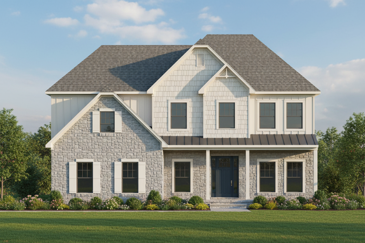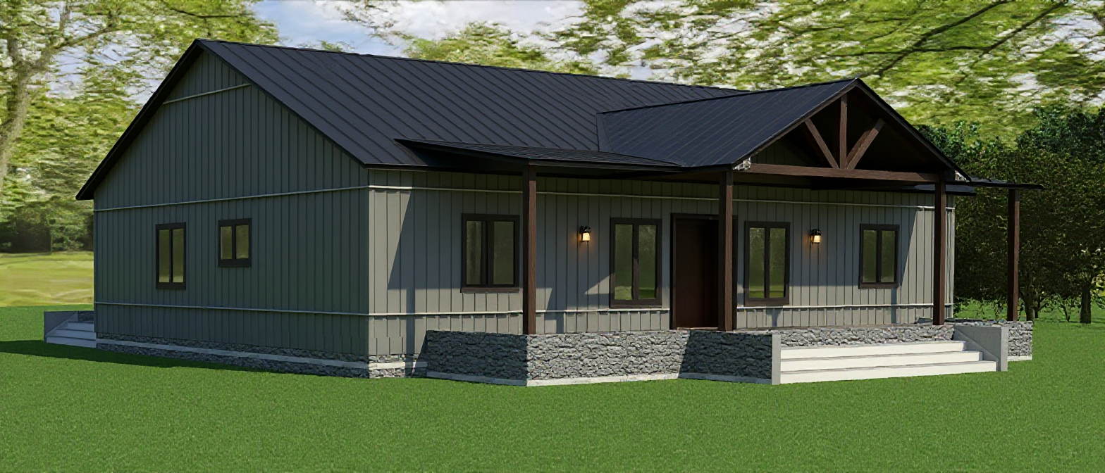 its a house with grey vertical batten siding it has grey stone for the foundation wall and porch wall it has a black metal roof there are dark wood posts and same color wood trusses on the porch the house sits on a grass lot add light fixtures to the porch wall
