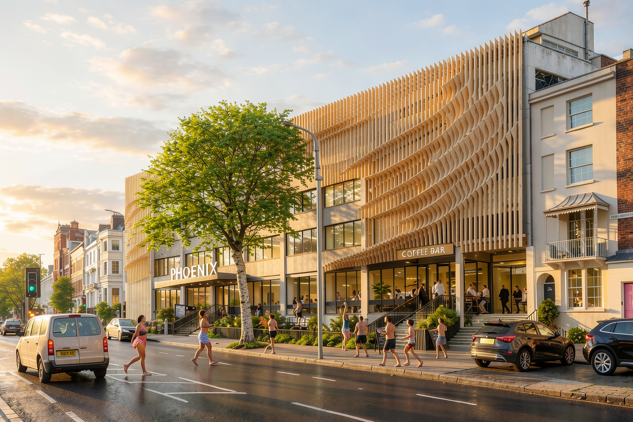 nordic exterior shot can you make this photorealistic with a pale warm silver timber cladding sitting over a darker stone ground floor level with a realistic swimming pool in the foreground and a view out over padstow bay in the background keeping the same view and showing neighbouring buildings on the other side of the garden walls add planting and garden furniture outside the building and also some activity in the pool add some more clouds to the sky the top parts of the gable extensions should be wide board warm silver timber cladding the lower parts are a medium dark stone the garden walls in a drywall stacked cornish granite architecture