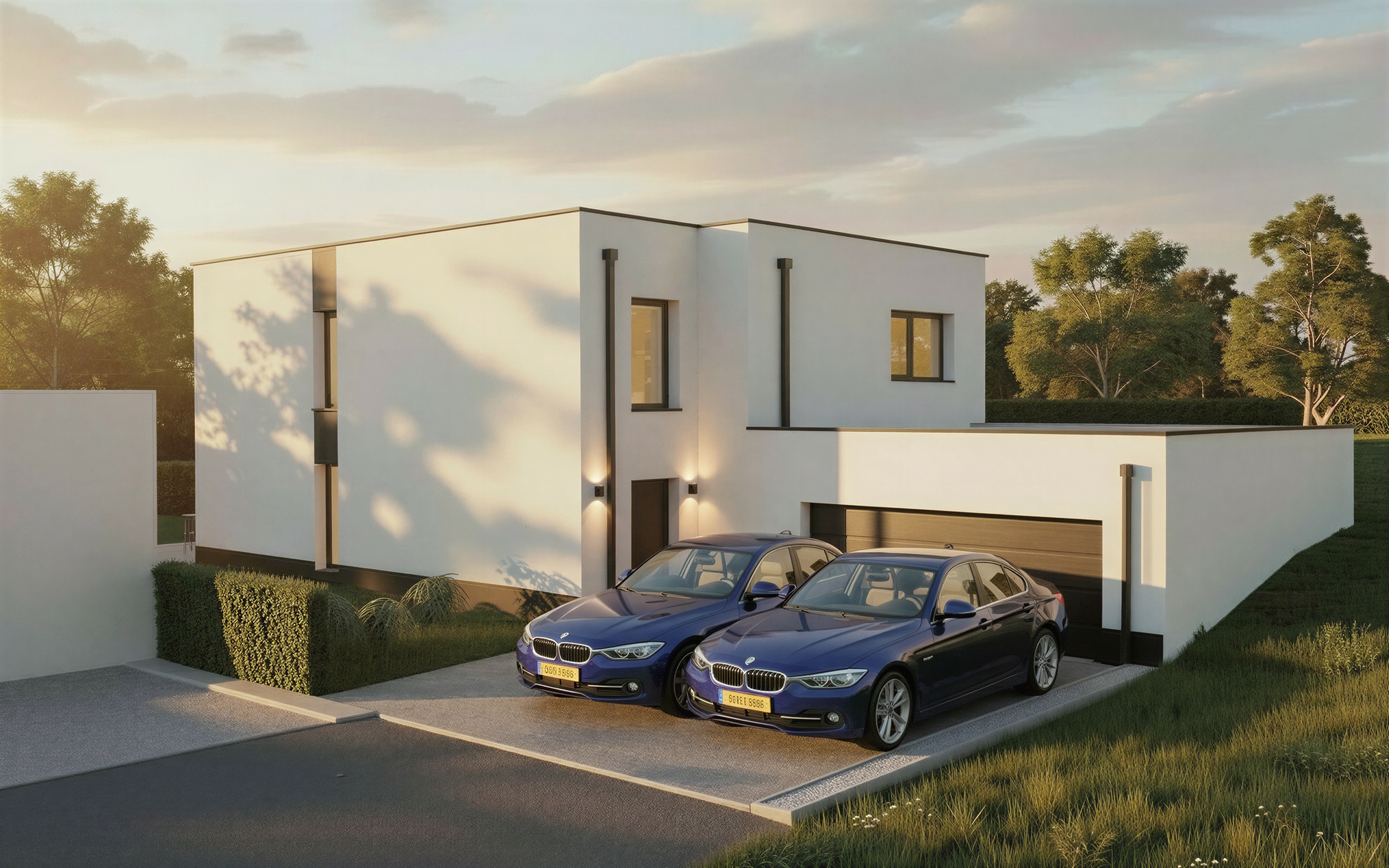 the cars are too big please make them smaller so both can fit through the garage door make sure the proportions of the cars and the garage door stay realistic