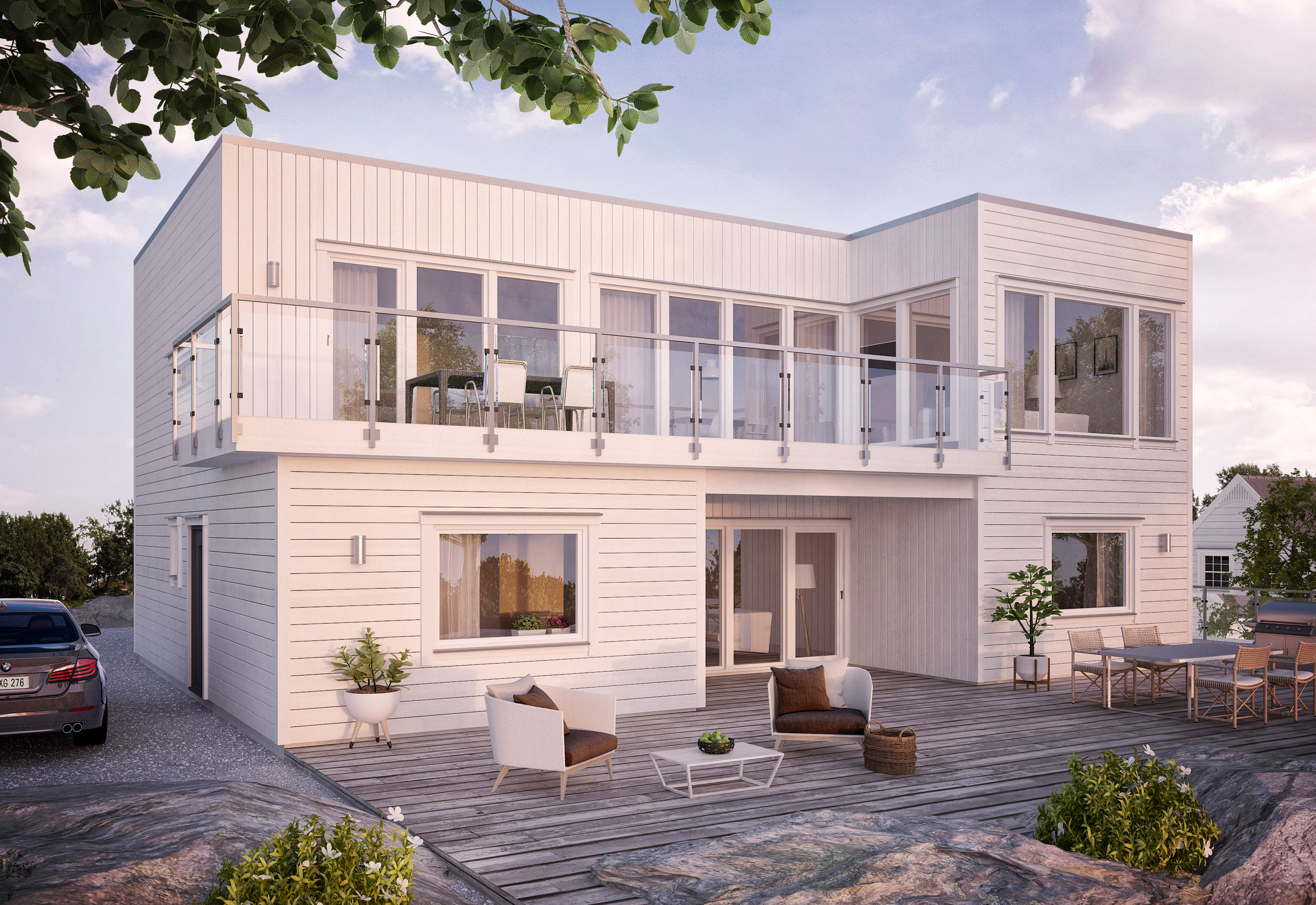 turn this 3d image into a perfect photographic picture do not change anything on the house make a soft light in the sky
