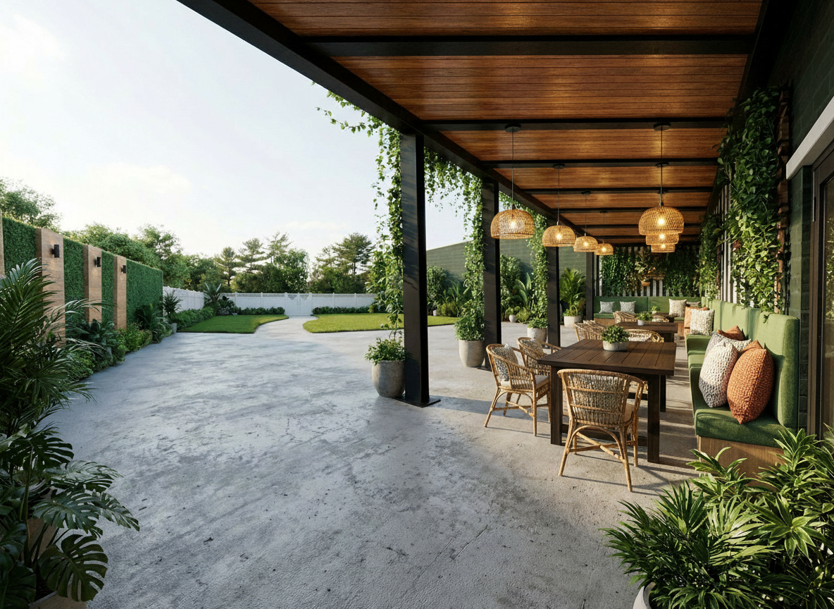 add two high top tables and chairs in front of the wall with greenery and wood columns