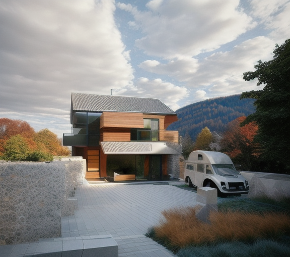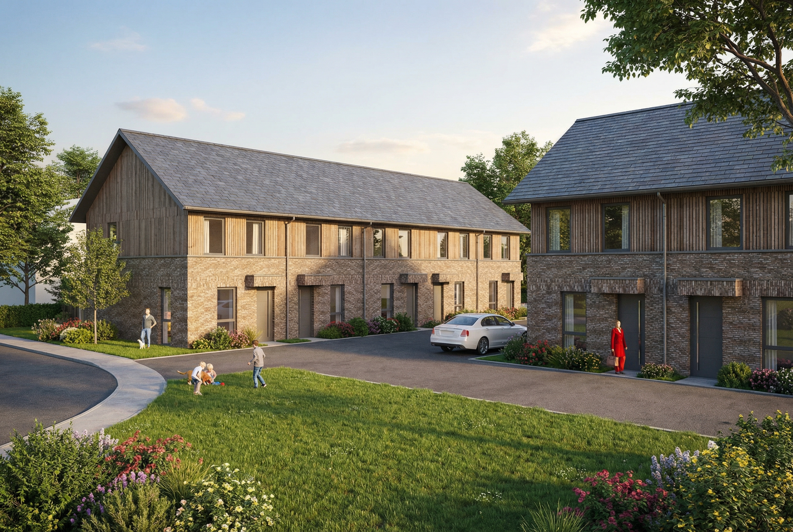make a photorealistic rendering of the houses the weather is sunny with a few clouds in the sky add a lot of people bushes trees and flowers
