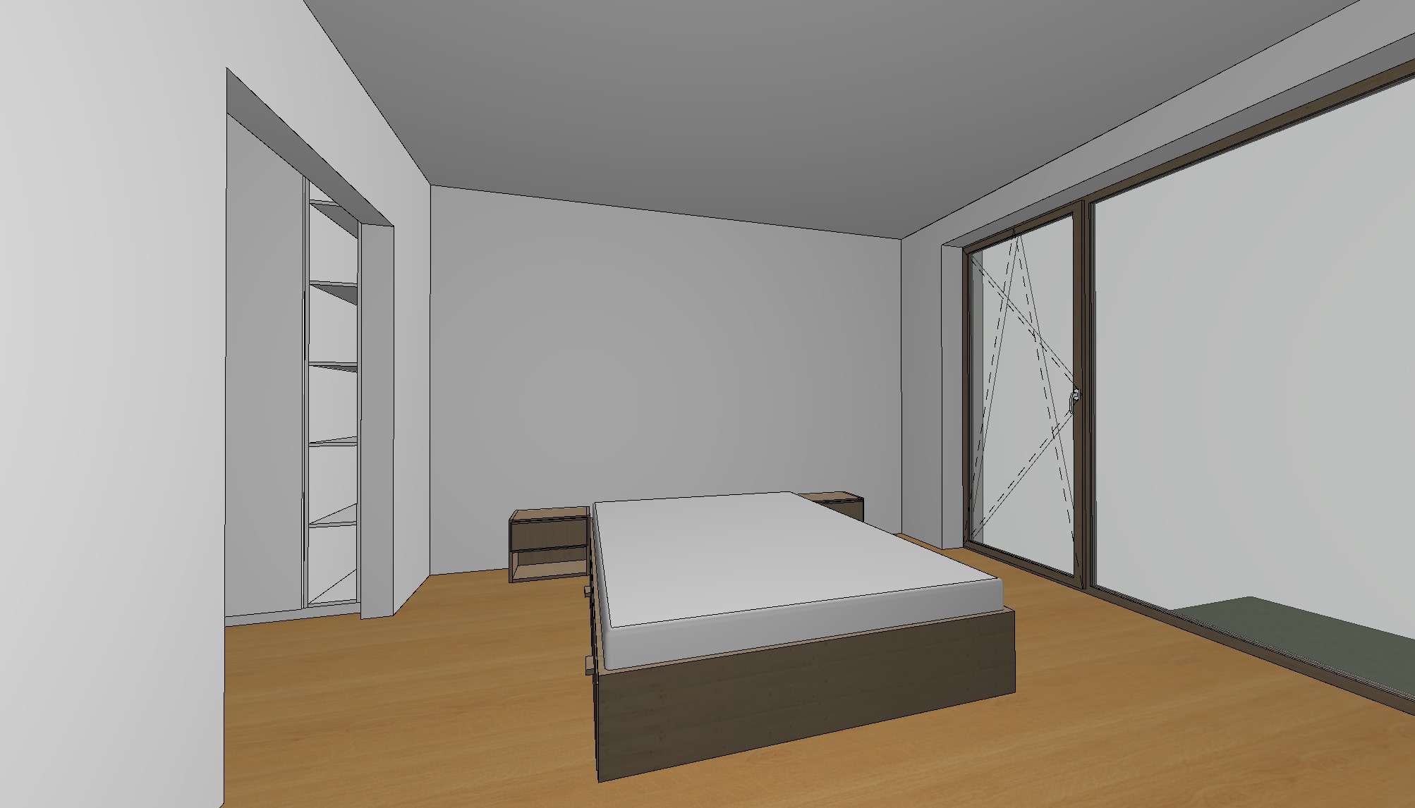 modern bedroom with light oak flooring white and oak wood furniture large window the fill the room with natural light a cozy bedsheet with pillows and blankets in a natural soft colo pallete