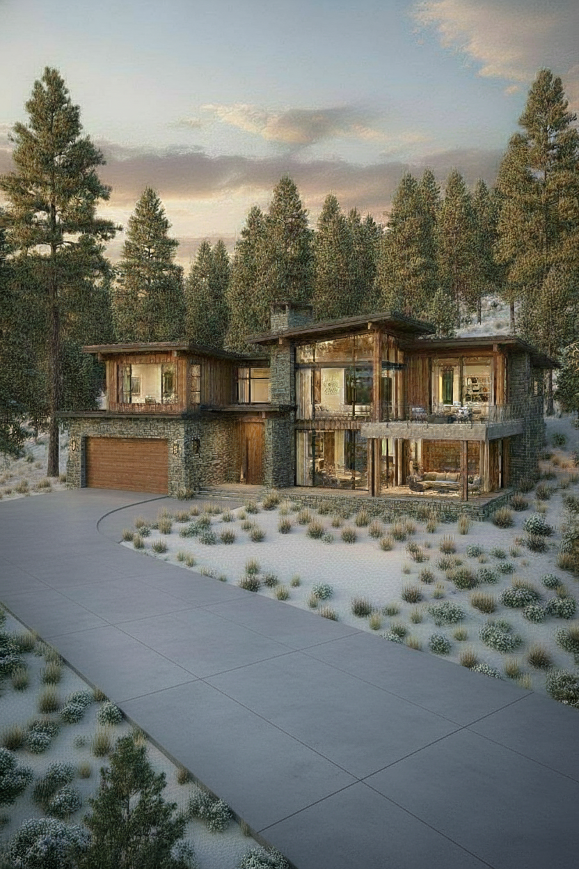 exterior shot generate a rear perspective view of the same house shown in the reference image keep the design materials and lighting identical imagine the camera rotated 180 to the opposite side of the building show the back fa ade and surrounding landscape not the front view again