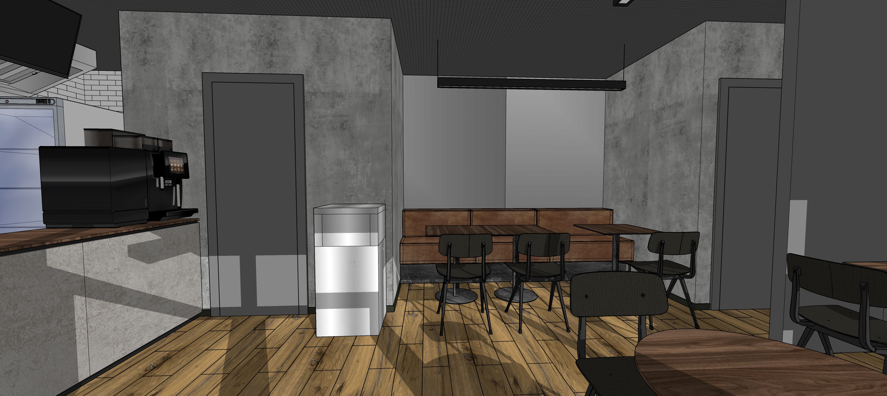 urban coffee shop interior industrial modern style exposed concrete black metal oak wood lighting cinematic atmosphere photorealistic render high resolution