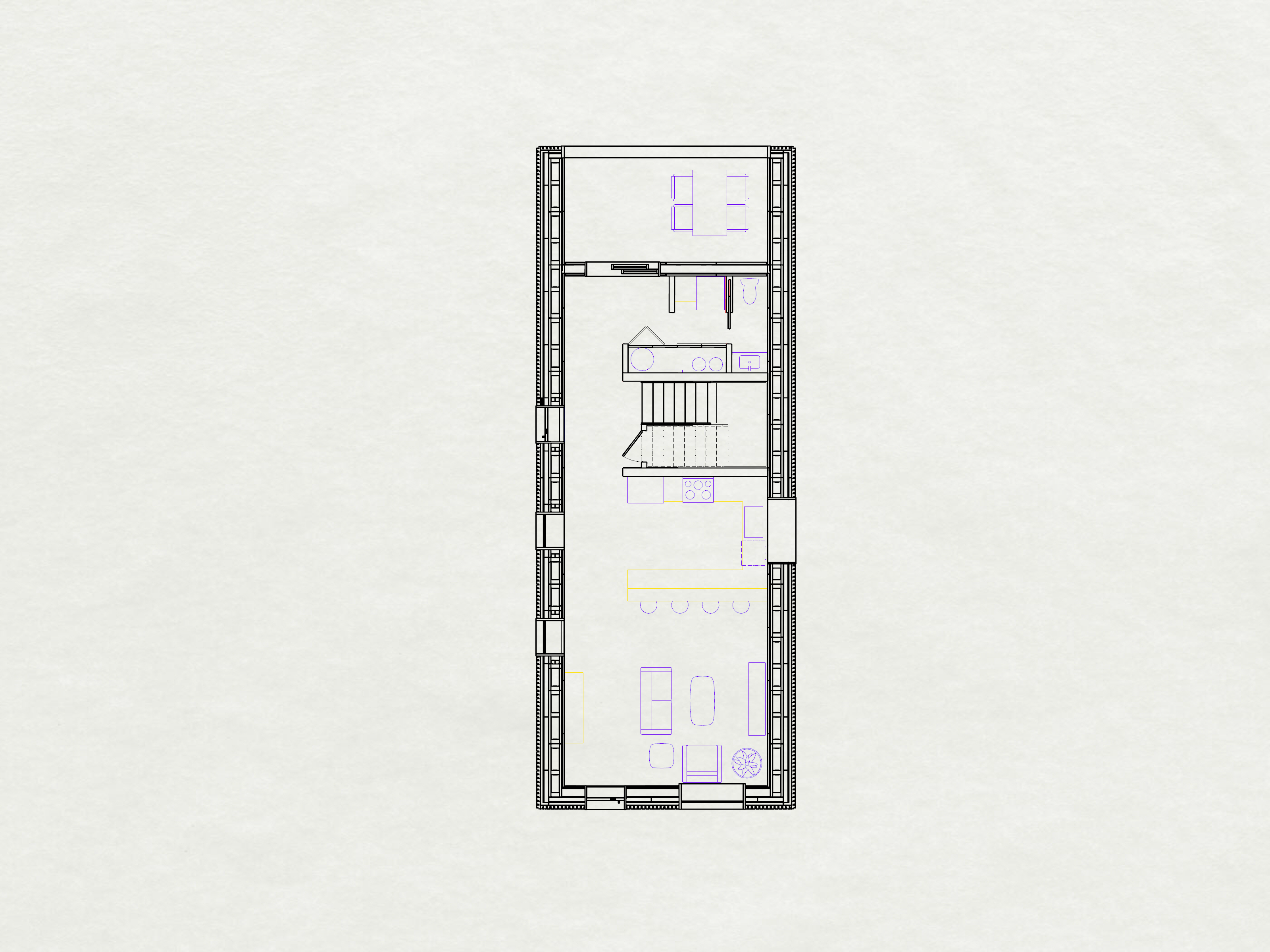 convert this floor plan into a realistic birds eye 3d view of a full house show the space from an elevated angle with furniture walls and details visible use the same furniture as shows on the plan do not change the orientation of the floorplan
