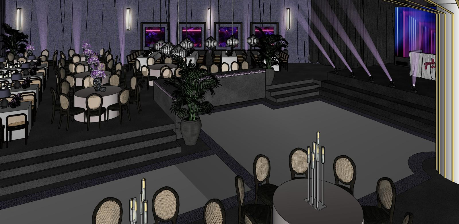 modernist interior shot create a luxurious banquet hall atmosphere with dim ambient lighting use deep charcoal gray for the walls and floors accentuated by soft purple lighting that casts elegant shadows adorn the tables with ivory tablecloths and glass candlesticks incorporate black wood chairs with beige cushions for sophistication add lush green plants in large dark gray vases for contrast use vibrant magenta and blue neon art pieces on the walls for a modern touch aim for an upscale elegant atmosphere with a contemporary flair architecture