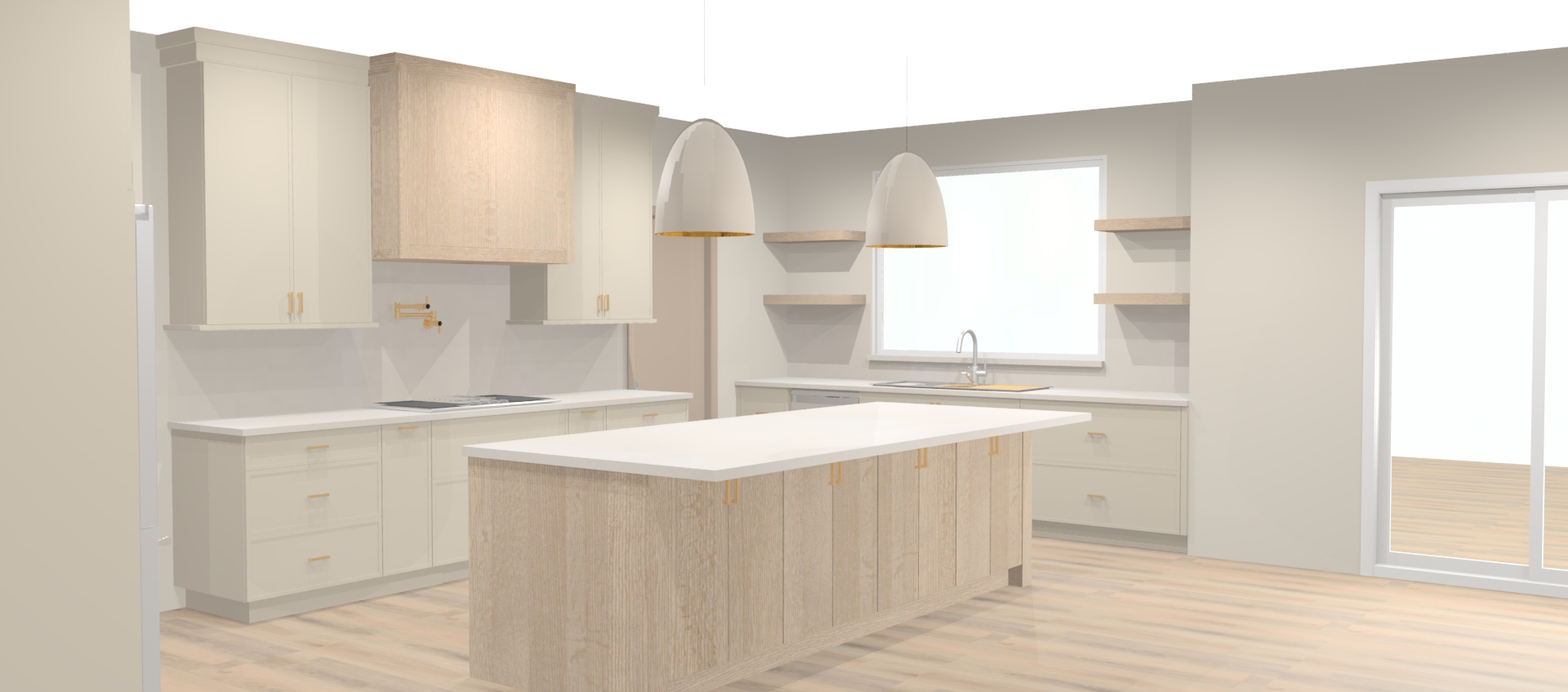 realistic image with full height quartz splash to bottom of upper cabinets and bottom of hood and bottom of floating shelves