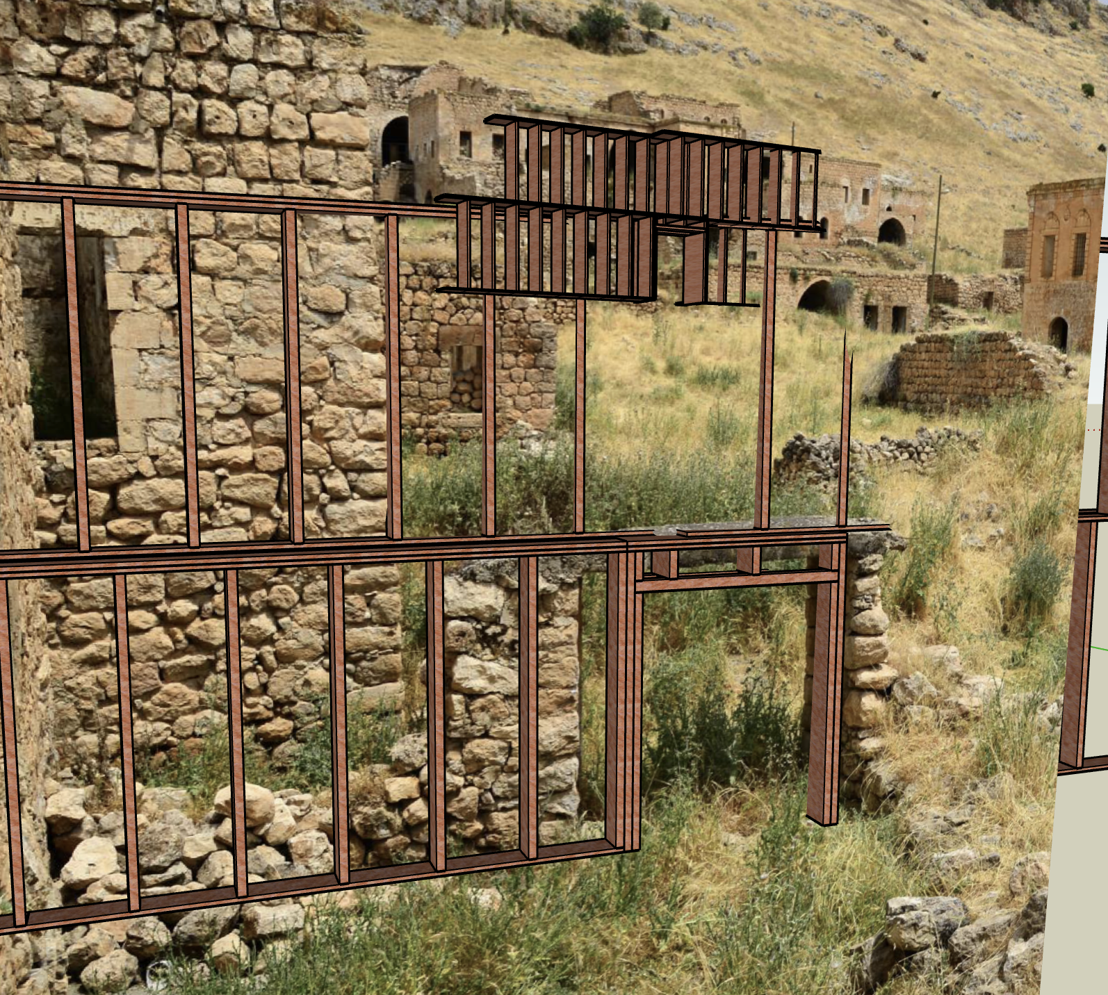 high tech exterior shot old ruins in nature thin corten steel bars architecture