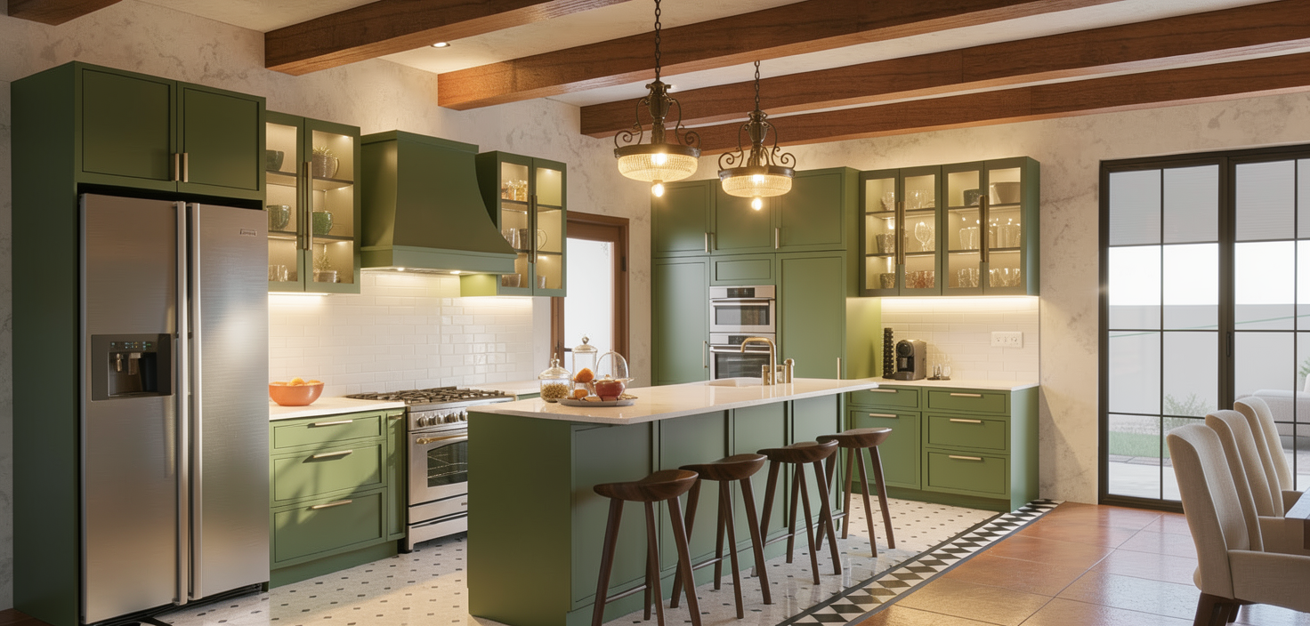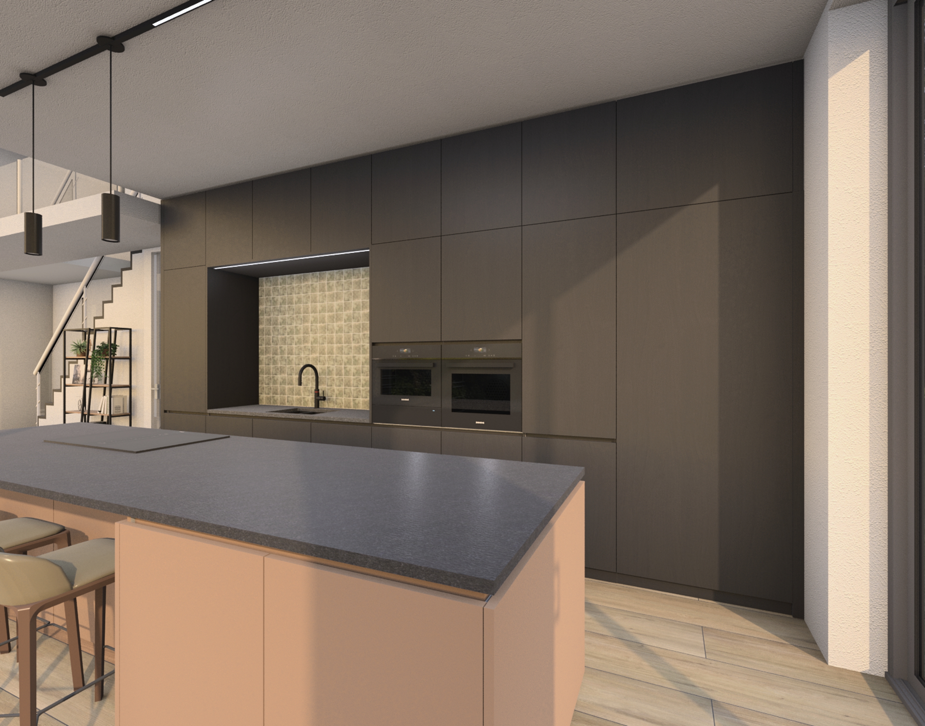 stay true to the original design make the lighting realistic both the incidence and its intensity make the details lifelike refine the details and the lighting elements represent the devices throughout the drawing as realistically as possible render everything in the highest quality make it sharp keep the colors as the input shows make the kitchen island in the colour caramel beige