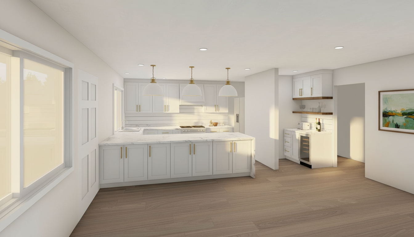 i want the kitchen to be in a farmhouse modern with white shaker cabinets and a marble counter top the nook will house a beverage or wine area add better lighting for the interior rendering and add pendant lights over the peninsula add a wall art as needed keep walls locations appliances will remain in same location add furniture in living room area and make front door look better you may change the wall color
