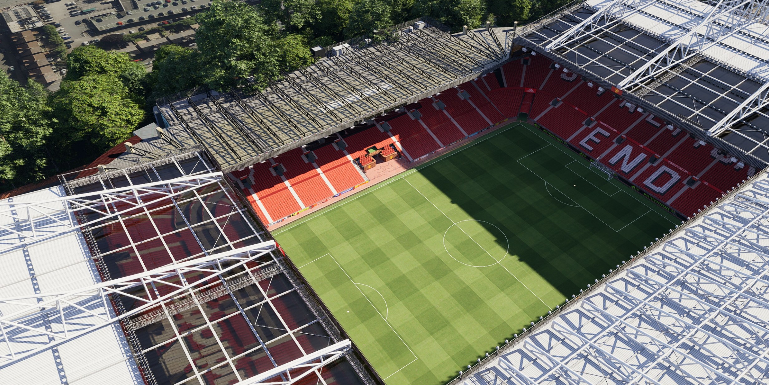 add realistic seated football fans through the stadium stands the fans should be wearing red football shirts hats and scarves cheering or watching the game with natural seated poses ensure they match the camera angle perspective scale and lighting of the original render keep all existing stadium architecture seating lighting shadows and pitch completely unchanged maintain photorealistic detail and consistent render quality