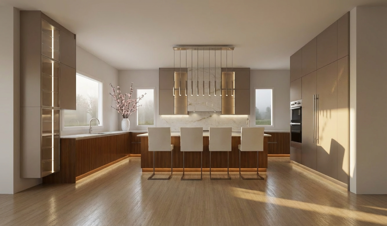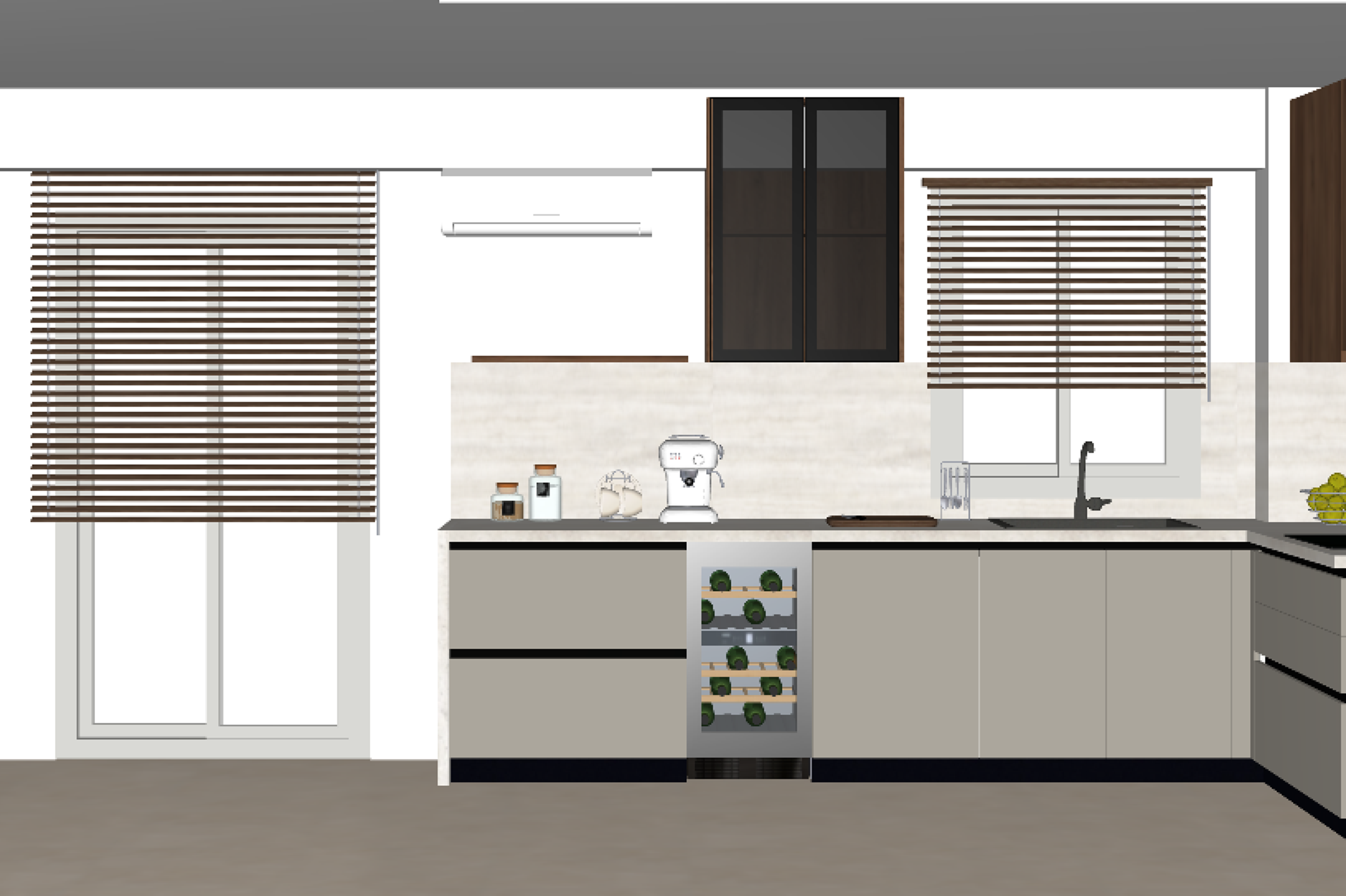create a beautifully rendered modern kitchen the cabinets are a rich walnut brown contrasted with sleek light gray countertops include a beige tile backsplash to add depth the walls are a soft gray complementing the ceiling add a large abstract artwork with tones of black white and rust on the white adjacent wall include stainless steel appliances and a touch of greenery with a small bowl of green apples for freshness the atmosphere should be warm and inviting with natural light streaming through wooden blinds casting gentle shadows on the warm taupe colored floor