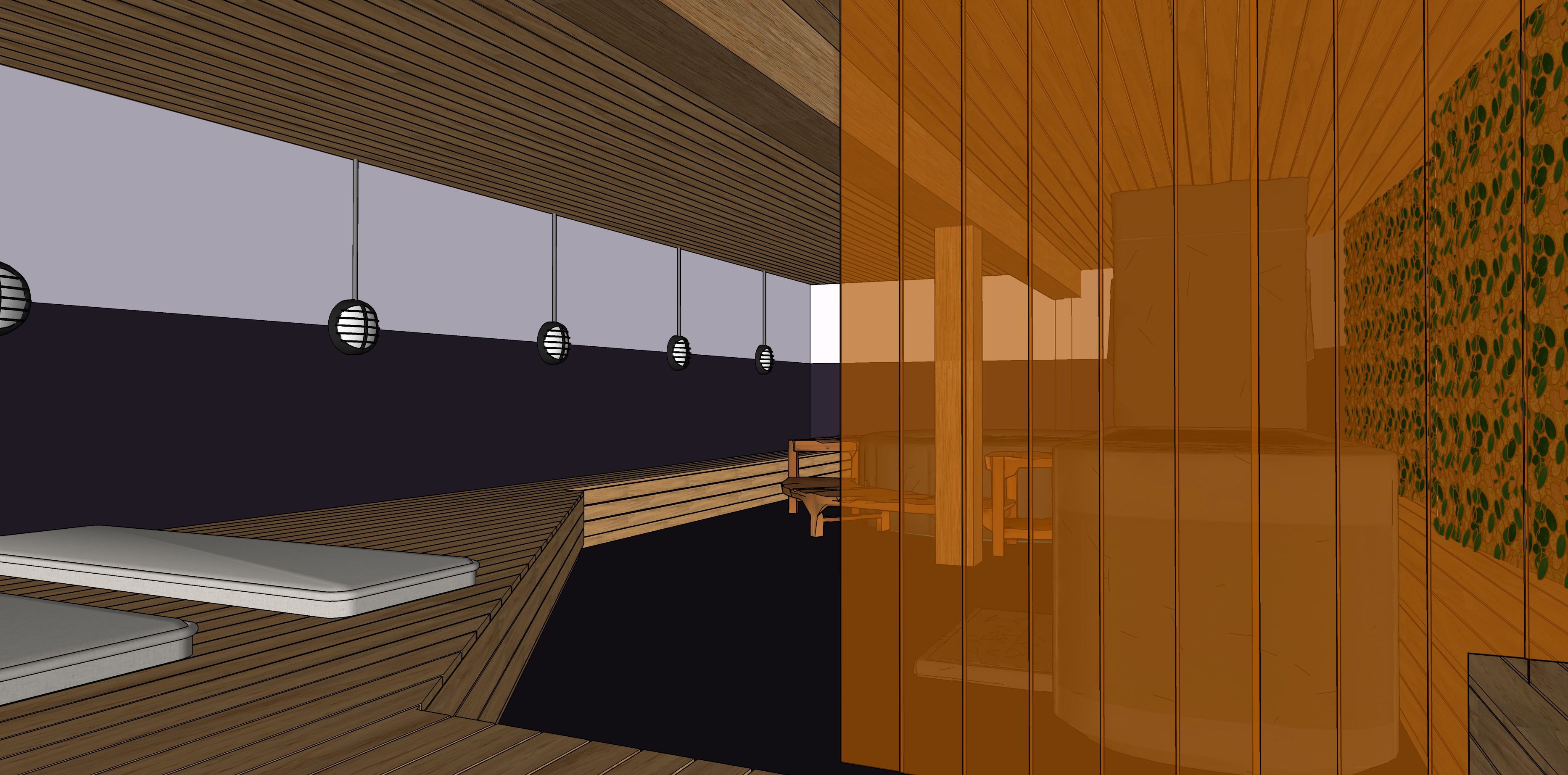 do not change the colors materials finish keep the viewing angle turn on the wall lights it is a basement without windows but still bright ambiance with dim lighting the floor is painted dark purple concrete the bottom of the dry walls are dark purple but the top of the walls is white with a very little tint of lavender colored the curtain is made of frosted amber plastic slats the ceiling and the benches are made of wood dried construction spruce wood lumber the cushions on the benches are made of linen the structure around the spa is made of wooden slats the exterior of the spa is a dark gray make a light under the wood bench