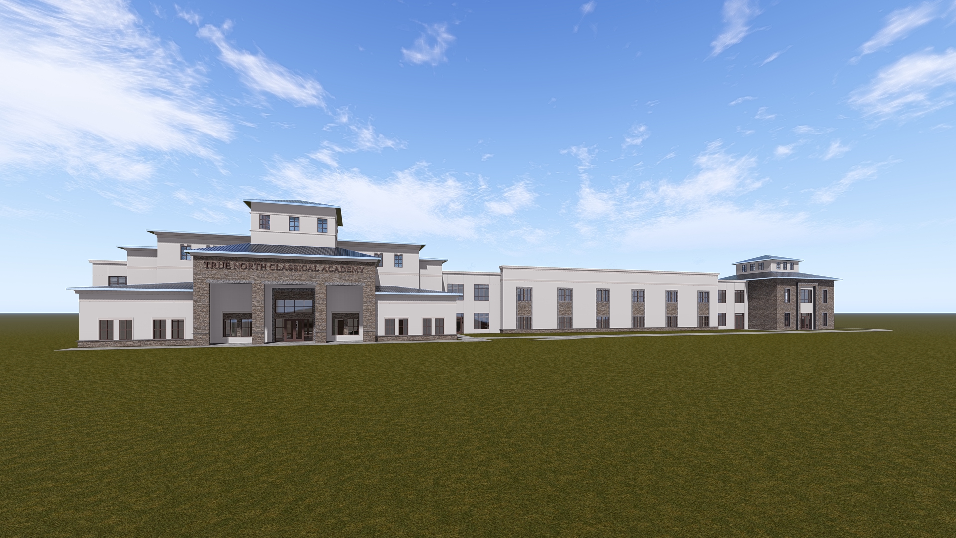 exterior design for school in a modern style enhance the current materials stone veneer stucco and stand seam metal roof