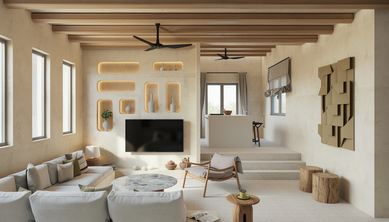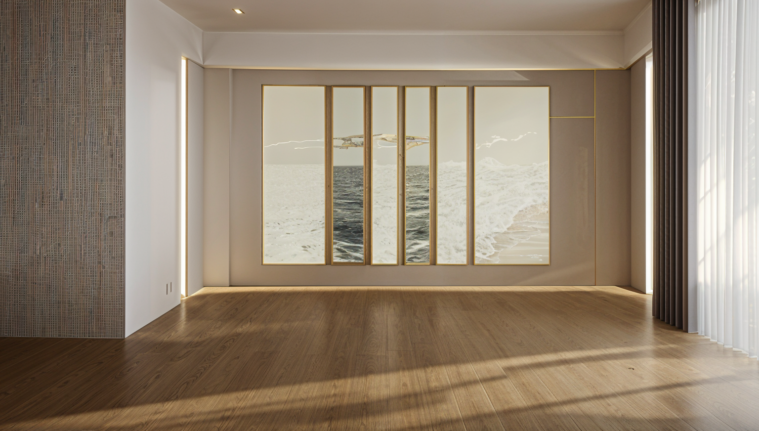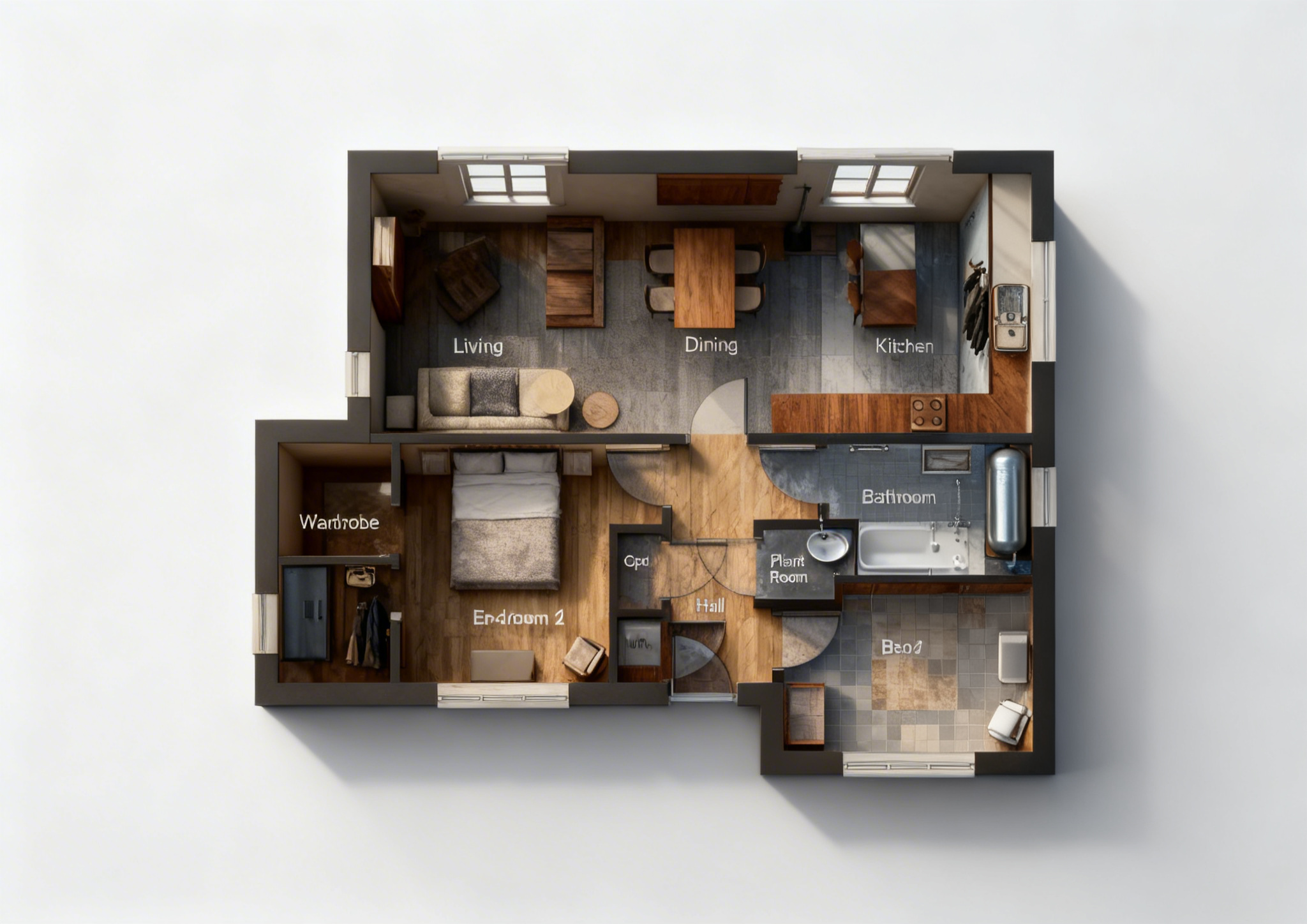 the furniture is all mate material the beige material is cashmere mate the wood texture is grey brown oak there is a mirror on the right
