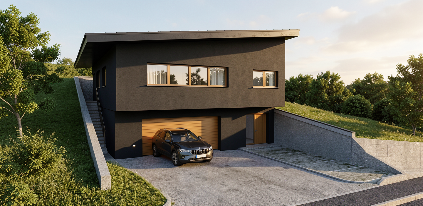 modernist exterior shot transforms the provided image into a high end photorealistic rendering with warm golden hour atmosphere soft and bright lights that keep everything in exactly the same proportions same wall finishes same materials and same spatial configuration do not move or alter the geometries of objects textures colors or furniture positions the geometries and curves must be equal the wooden part on the left wall consists of shelves the wall behind must be visible architecture