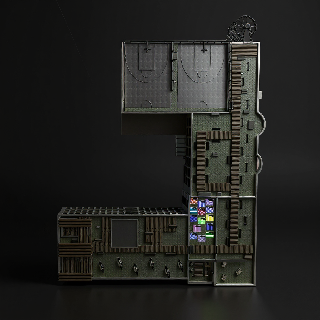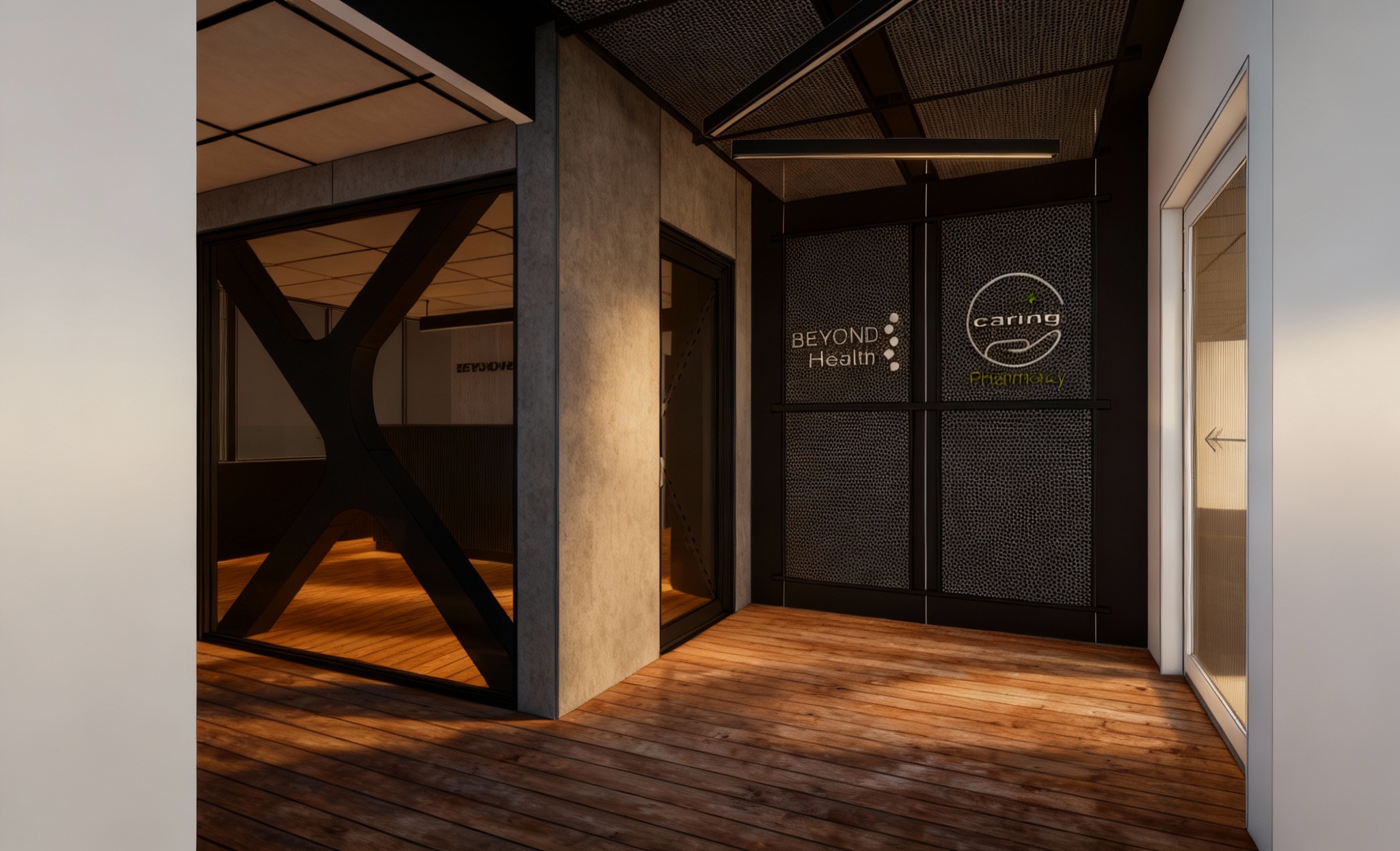 render a modern sleek interior with a calm and welcoming atmosphere the wall on the left is a smooth concrete finish with a large black framed glass panel featuring a subtle x design with blue led lighting the floor consists of light oak wood planks radiating warmth and comfort the right wall showcases a sophisticated dark charcoal textured surface accentuated by elegant white and green illuminated logos overhead a grid ceiling with soft ambient lighting enhances the serene environment the overall atmosphere should be professional yet inviting with a balanced juxtaposition of industrial and warm elements