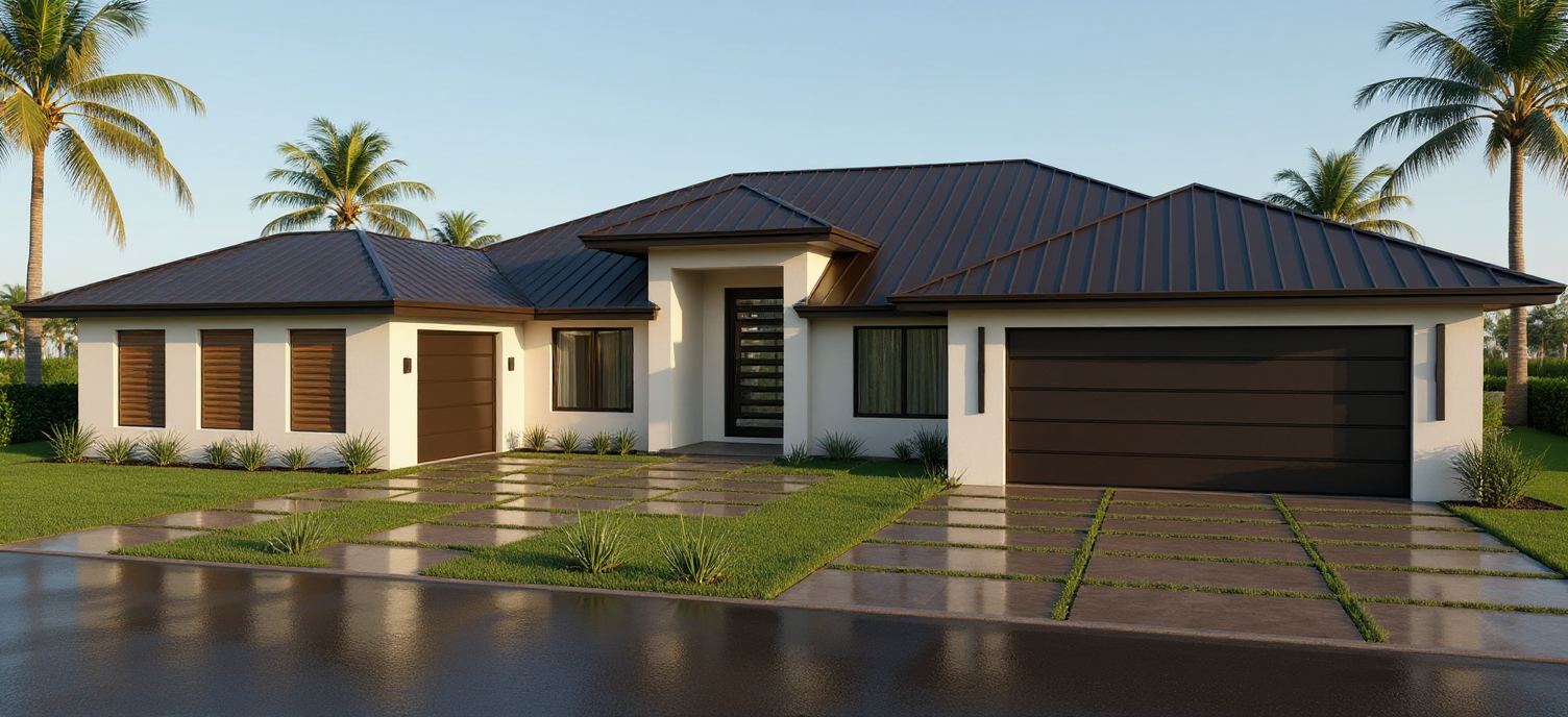 render a luxurious modern outdoor patio with a serene atmosphere the main structure features smooth white walls and a chocolate brown metal roof the patio is set with light gray stone flooring include an outdoor bar with a brown wood finish and matching bar stools the pool water should be a crystal clear aqua blue with white loungers placed alongside add lush greenery surrounding the patio for a refreshing touch capture the scene under a bright blue sky enhancing the peaceful and inviting ambiance